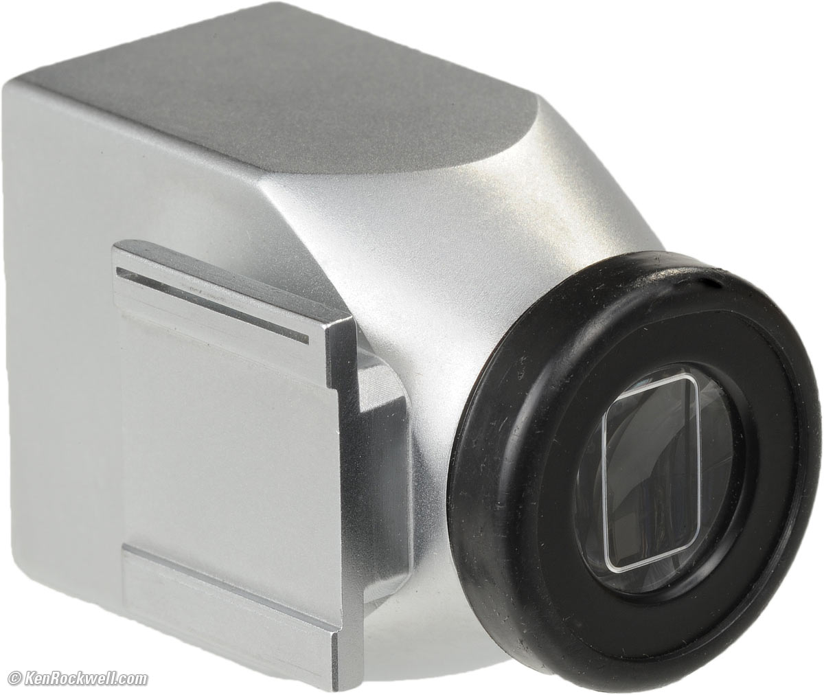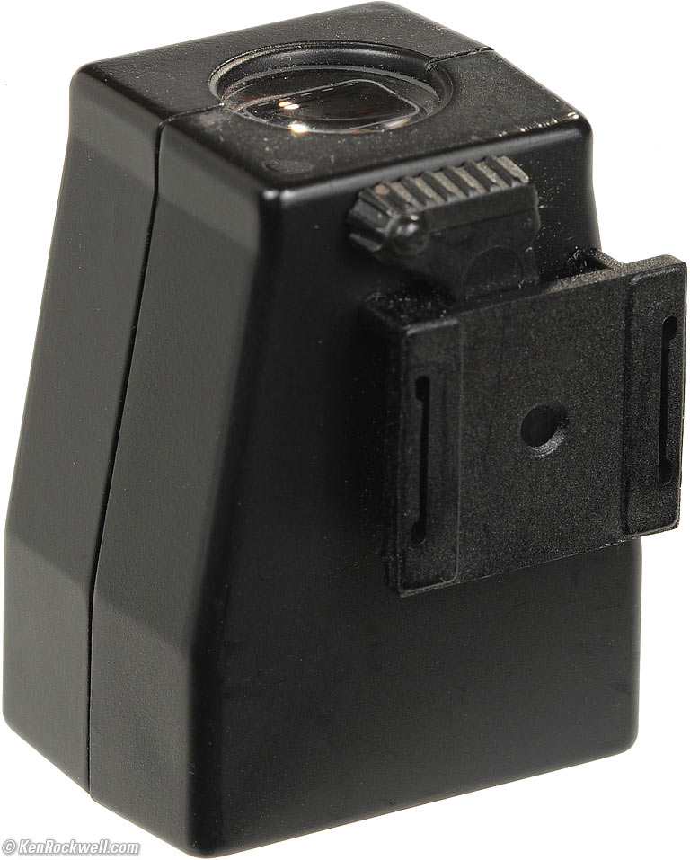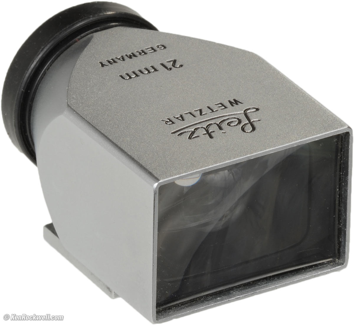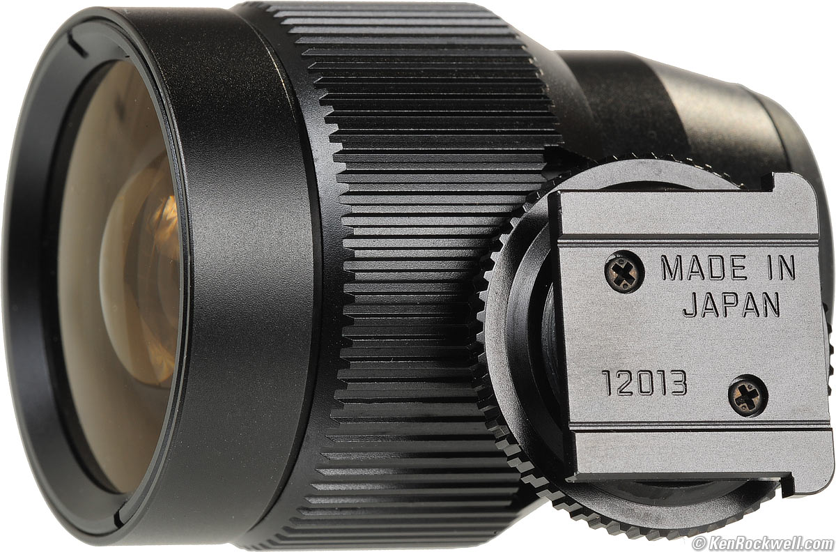 Cosina (Voigtländer) Finder top Cosina 21mm finder, twice life-size. enlarge or actual-size. Cheapskates may settle for the $130 Voigtländer-branded Cosina finder. It works, but it's a cheap feeling thing. It has no lock: just your faith that its molded plastic shoe won't slide off after years of use. I dislike that this finder shows the area not shown on film, but others may prefer this. The Cosina finder also has an unprotected front element: don't put it down front-first, because you'll grind a very visible spot into the its front glass. The worst think about this Cosina finder is that the mirrored lines are needed to define the active image area, since the finders shows more than what lands on your film, but that the finder lines of the Cosina finder aren't always visible. I hate that I need to wiggle my eye around to get the lines to show up as I'm trying to concentrate on my composition. It's not always easy to see the frame lines in the Cosina finder, while the Leica finder is always very clear because it only shows the image inside a black rectangle, even if you can't see the Leica's frame lines which parallel the sides of the image. The Cosina finder distorts the image like all these finders, but has straight frame lines for less accurate framing. I weigh it at 1.115 oz. (31.6g).