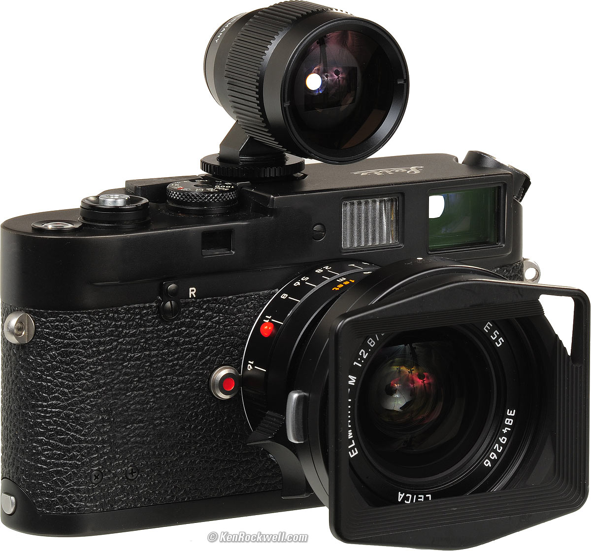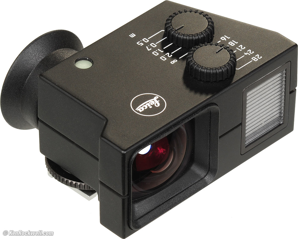 Leica Universal Wide Finder (12 011) top Leica Universal Wide FInder 12 011. enlarge. Leica's $1,000 Made-in-Germany Universal Wide Finder works great and adds a bubble level visible in any light through the finder. The Leica Universal Wide FInder is the world's most precise 21mm finder, as well as the world's most precise 16mm, 18mm, 24mm and 28mm finder. It's also much bigger than anything else. What a pain. If you don't mind the weight, it's an all metal Made-in-Germany meisterstück and has a screw-down friction lock on its metal foot. The finders above are all fixed-focal-length, but you can screw up and knock the variable focal length setting of this finder. Each of the two setting knobs needs a push-to-release lock on it to prevent inadvertent misadjustment. It has frame lines for 16, 18, 21, 24 and 28mm lenses. Only one appears at a time, which is better than Leica's own cameras. Its magnification is fixed at 0.28x. Different finder lines appear as you change the settings. I dislike the view through the Leica Universal Wide Finder because it includes a lot of view outside the active film area. I can compose more strongly if I only see what's on film and see black beyond, as most other finders do. The view is moderately polarized so that the bright lines work. Be careful when viewing through polarizers or polarized subjects, like skies. They will look different through the finder compared to what you get on film. Viewing is optimum with your eye 1/2" (15mm) away. Get too close and the view is a little softer. There is a glow-in-the-dark bubble level visible under the frame lines. You can see it even in pitch blackness! This finder is unique in having a second window just to ensure that the frame lines are always bright and visible, just like good rangefinder cameras. This puts this finder in a class above everything else, and also why it costs $1,000. It has somewhat more barrel distortion than the rest of these finders. It has the unique advantage of distorting the frame lines to match, so you get a very accurate idea of where straight lines will go. It's 2.0 x 2.8 x 1.5" (52x 70mm x 38mm) DWH, including the foot. There's one more teensy-weensy problem with this finder: on Leicas with canted rewind knobs, which is just about every camera they've made since about 1967 like the M4, M4-P, M6 and M7, the rewind lever hits the finder in part of its travel. Whoops! Don't scratch your $1,000 finder! You seem to be fine with the M3, but I'd put a piece of black electrical tape on the finder's side to prevent scratching it. I weigh it at 4.320 oz. (122.5g). Leica specifies 5.9 oz. (150g), which is more than the Cosina (Voigtländer) 21mm f/4 lens!