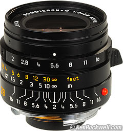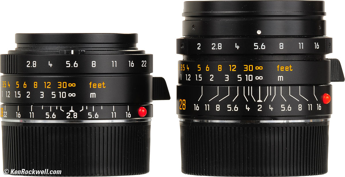 Introduction top Intro Specs Performance Usage Compared Recommendations This Leica 28mm f/2 Summicron-M is a wide-angle lens intended for journalists. Get this lens if you're willing to trade size, weight, price and a partially-blocked viewfinder in exchange for a one-stop gain in speed over the 28mm f/2.8 ASPH. This 28mm f/2 will block the lower right corner of your viewfinder, unlike the smaller and less expensive 28mm f/2.8 ASPH. If you're a journalist, you'll trade anything to get f/2, but for most people, including myself, the smaller, lighter 28mm f/2.8 lens does everything as well and doesn't block my viewfinder. I'll refer both to the 28mm f/2.8 and 28mm f/2.8 ASPH and 28mm f/2 and 28mm f/2 ASPH; I mean the same lens in every case. I'm too lazy to type "ASPH" a million times; I'm not referring to older non-ASPH versions except in the history section. Leica 28mm f/2.8 ASPH and Leica 28mm f/2 ASPH. enlarge.
