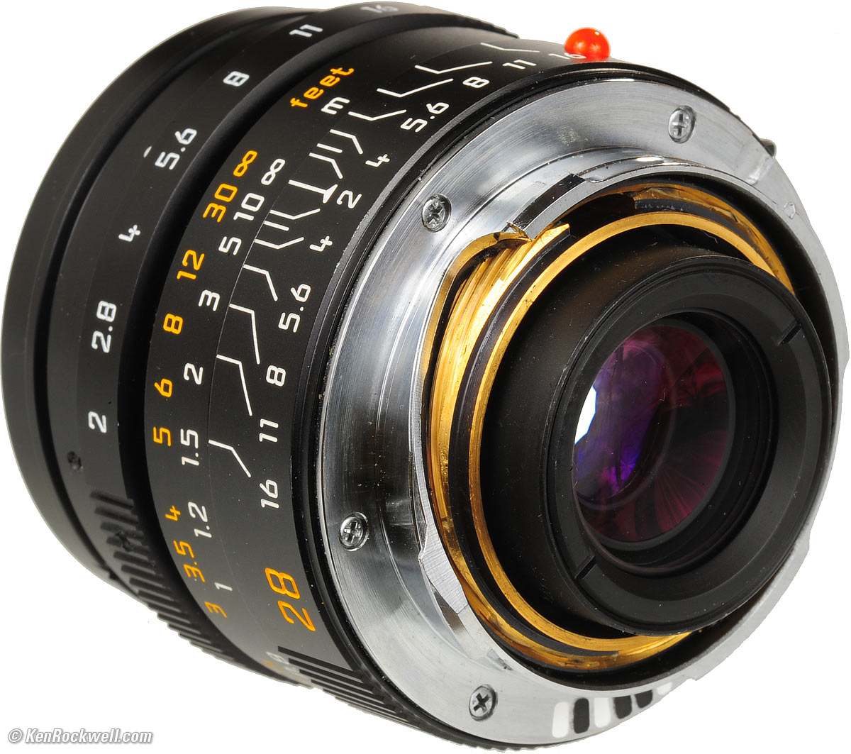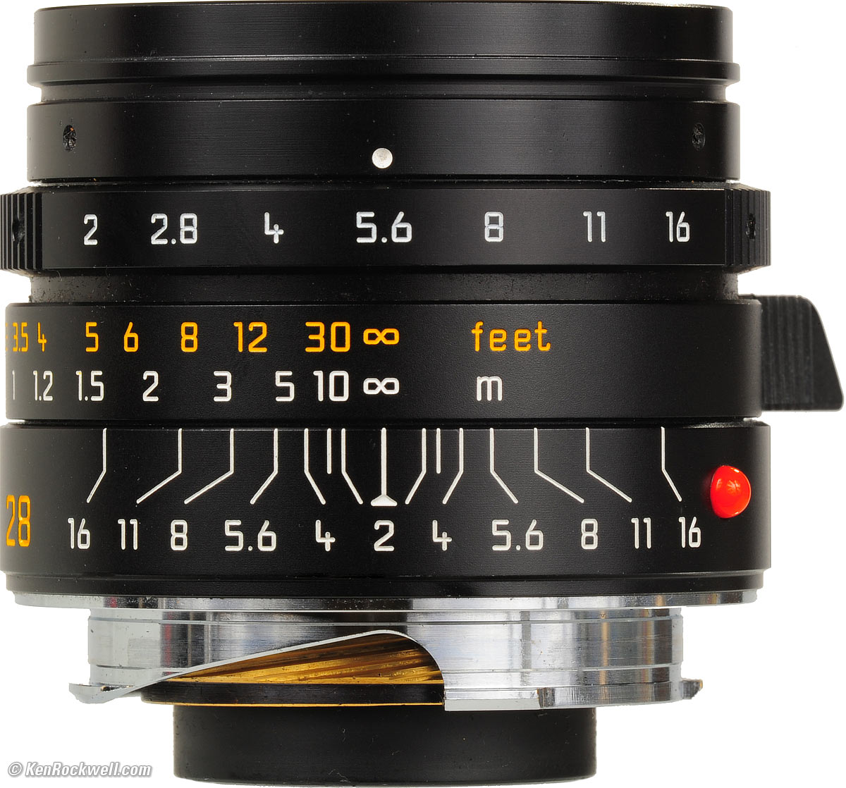 Mechanics and Construction top Rear, Leica 28/2 ASPH. enlarge. The Leica 28mm f/2 ASPH is made exactly like every other Leica M lens, which is superbly. This is why Leica has the problem of some men buying these lenses as if they were jewelry, instead of tools. In any case, this lens is made to last far beyond any of our life times. It will be taking pictures longer than I will. I know: I've bought other lenses made like this that were bought 50 years ago by guys who never thought that the lenses they were buying to take photos of their kids would be inherited by those same kids and still used long after they were dead. This of course brings us back to the jewelry problem: Leica lenses really are heirloom-grade. Hood: Vented plastic, with plastic lock levers and metal base. Front Cap: Snap-in plastic with plastic spring. Barrel: Black anodized aluminum. Focus Ring: Black anodized aluminum. Focus Tab: Black plastic. Aperture Ring: Black anodized aluminum. Focus Helicoids: Brass. Other Internals: Metal. Mount: Dull chromed brass. Mounting Index Dot: Red plastic ball. Markings: Engraved and filled with paint. Quality: Made in Germany.