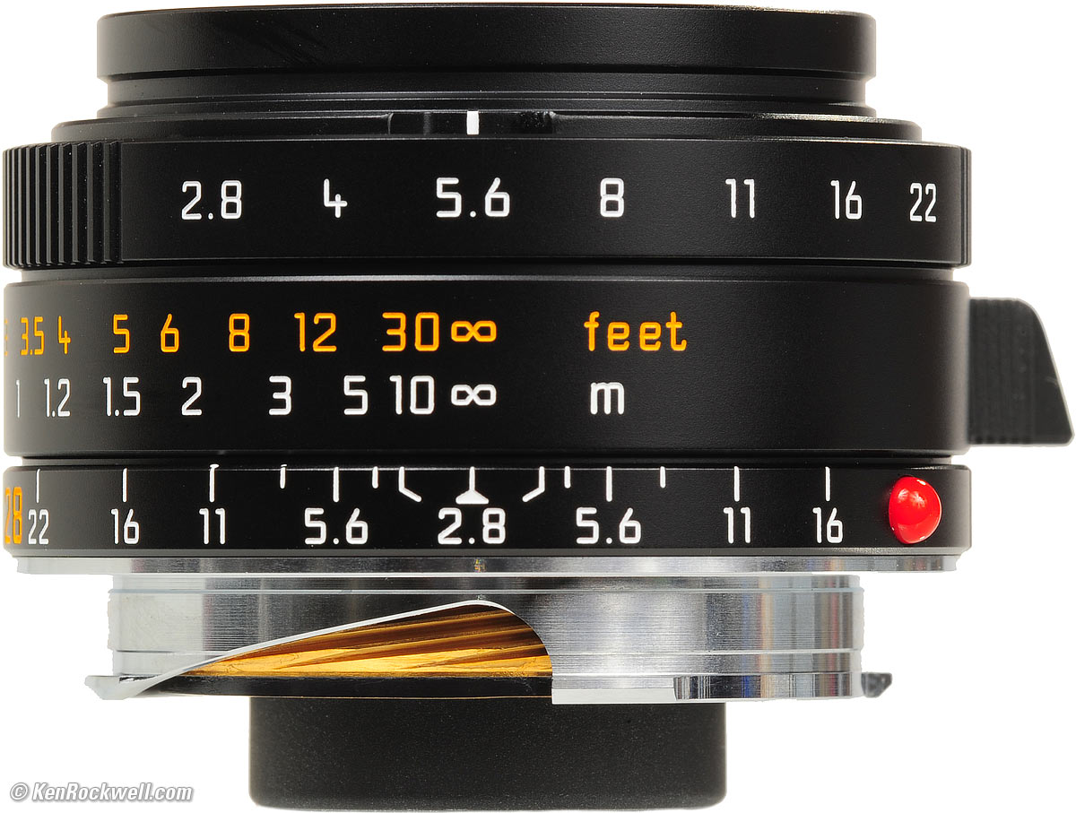 Introduction top The LEICA 28mm f/2.8 ASPH is LEICA's newest 28mm lens for its timeless M series of rangefinder cameras. It started shipping in October 2006. It works on every film and digital LEICA M made, from the film LEICA M3 of 1954 through today's M7 and digital LEICA M9-P, M240 and M10. The reasons I bought this lens new are simple: 1.) It's the smallest M lens LEICA has ever made. It's their first 28mm which doesn't get in the way of the viewfinder. It uses standard 39mm filters, which are the same size as LEICA's other compact lenses. Other 28mm lenses are bigger, and therefore block the lower right portion of your viewfinder! 2.) Zero distortion and ridiculous sharpness. It's got less distortion than the bigger 28mm f/2 ASPH, which would block the viewfinder. Whiners always moan that "they don't make them like they used to," but this LEICA lens looks and feels at least as well made as every other LEICA lens I've used, made since 1954. It's certainly nicer than the budget Summarit-M series. The typ 11606 version shown here was made from 2006~2016. The newer typ 11677 version has been made from January 2016~, it uses the same optics and is the same size and weight and differs only in that it takes a metal hood instead of the plastic one of this lens.