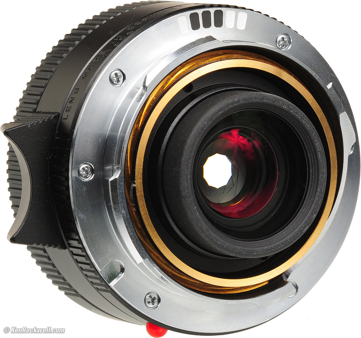 Ergonomics LEICA 28mm f/2.8 ASPH on an M7, side view. enlarge. You focus this tiny thing with a finger lever. There isn't much of a focus ring. The aperture ring is perfect. It's easy to adjust with a fingertip. The 28mm f/2.8 is so small that there's no big place to grab the barrel for mounting and unmounting. Your best bet is the tiny sliver of ring at the very base of the lens, the part with the red dot. The f/stop index is recessed inside the grooves which serve to align the hood, making it harder to see the f/stop index if you're not using the hood. If you use the hood, there are new indices on the tabs of the hood which fill the grooves, making it much easier to see.