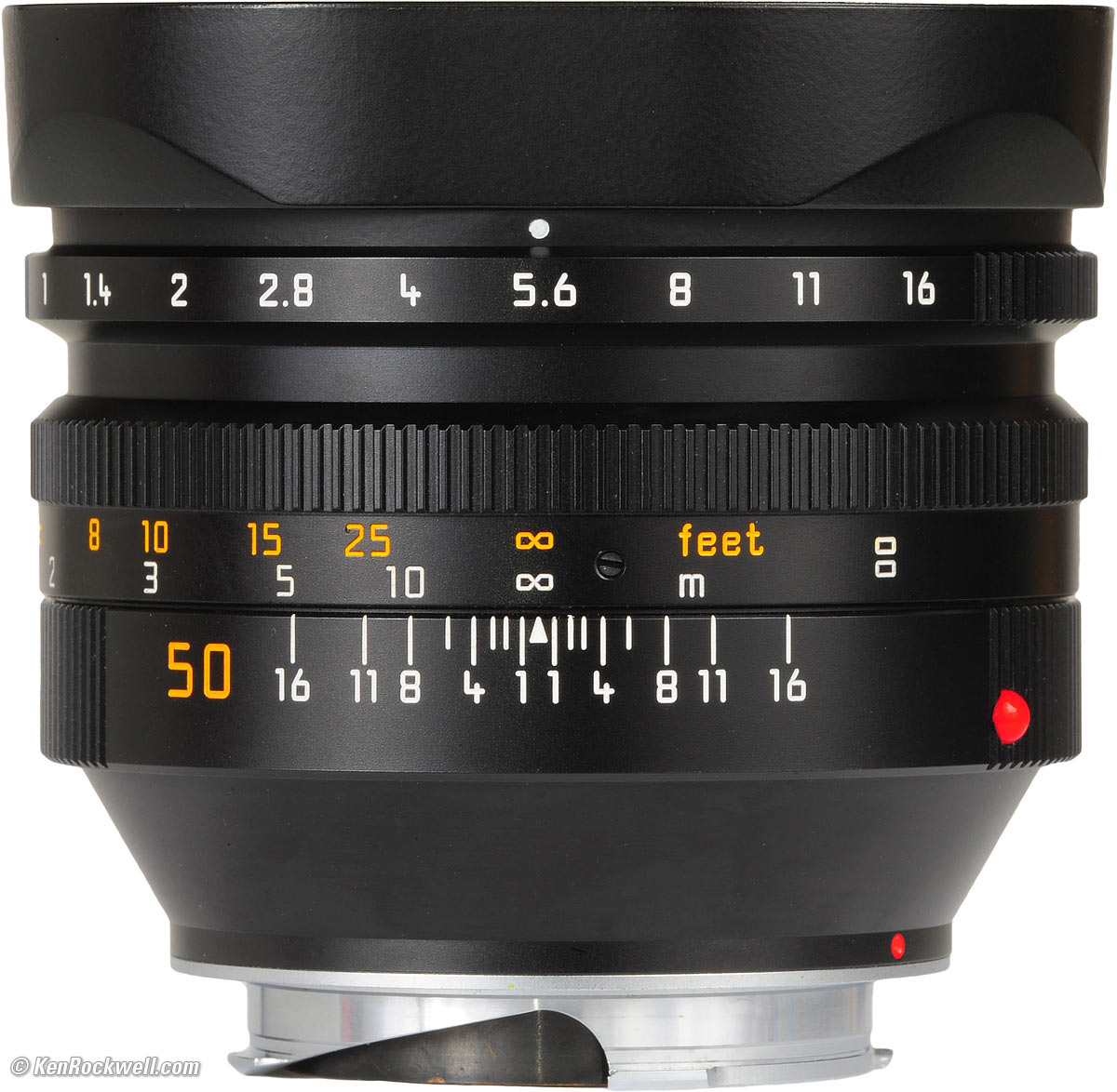 Materials and Construction top Like all LEICA lenses, this NOCTILUX-M is made of are solid metal. The only plastic is the red mounting index ball. To save weight, much of the outer barrel and control rings are made of anodized aluminum, with brass for the helicoids and most of the internals.All the marking are engraved and filled with paint.