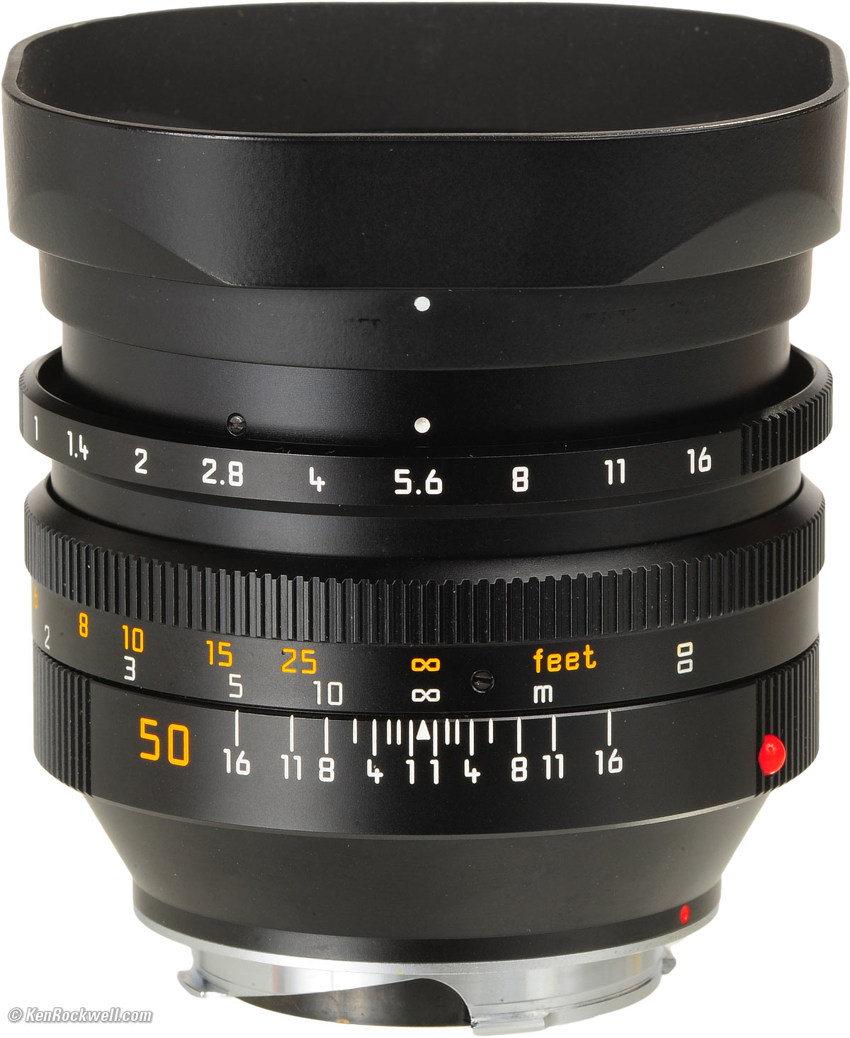 Hoods top 1978-1993: See Versions, above, for details pertinent to the earlier versions. 1993-2008: Built-in two section telescoping hood: LEICA NOCTILUX-M 50/1 with hood extended. Vergrößern.