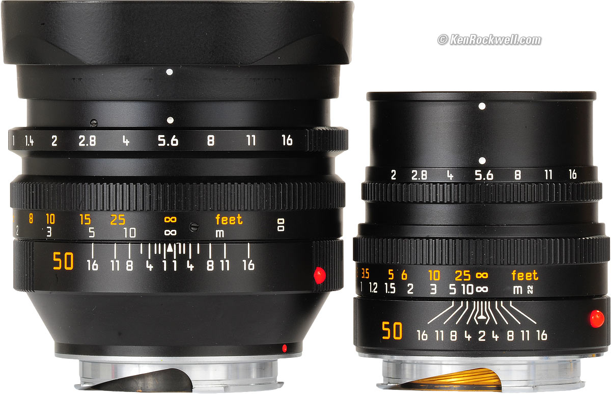 Compared top Intro Specs Performance Compared Recommendations LEICA NOCTILUX 50mm f/1 and SUMMICRON-M f/2. Vergrößern. Optics I've shot these directly against each other on the M9 at the test range. This is the result of live-fire exercises, not an analysis of charts. At f/2 and smaller, the current LEICA 50mm f/2 SUMMICRON-M has clearly superior performance. Unless you need f/1.4 or f/1, leave this old NOCTILUX-M to armchair enthusiasts. Compared to a LEICA SUMMILUX 50mm f/1.4 from 1964, this NOCTILUX-M is superior at f1.4. At f/2, the two lenses are similar, and at smaller apertures, the NOCTILUX is generally superior. That SUMMILUX isn't that hot on the M9. What's weird is that Dr. Mandler designed this NOCTILUX and today's SUMMICRON-M in the 1970s, but for some reason never redesigned the SUMMILUX, which could have used improvement. Leica sold this same SUMMILUX optical design for 43 years until 2004. I have not compared this NOCTILUX-M against the newest LEICA SUMMILUX-M 50mm f/1.4 ASPH.