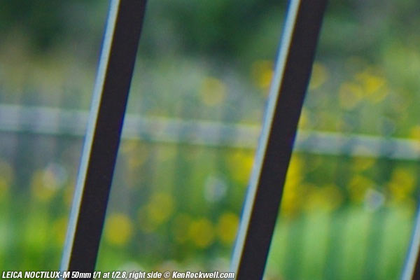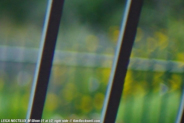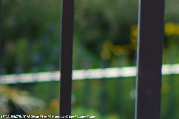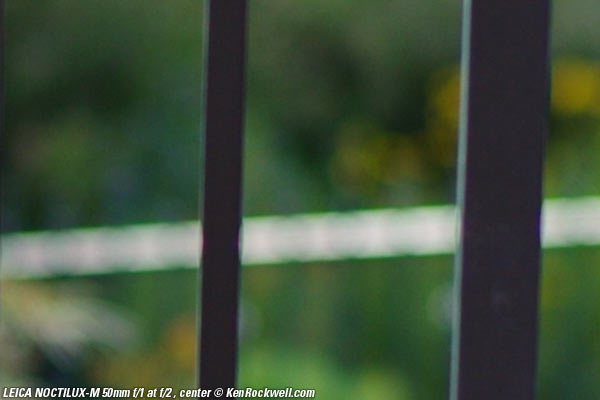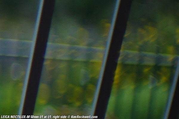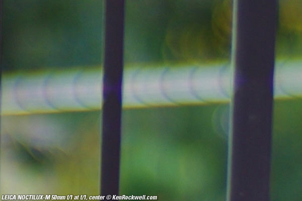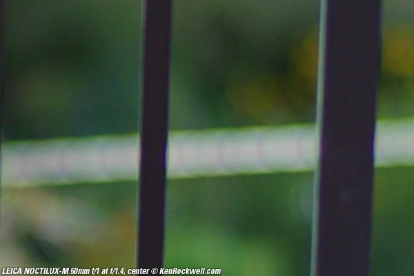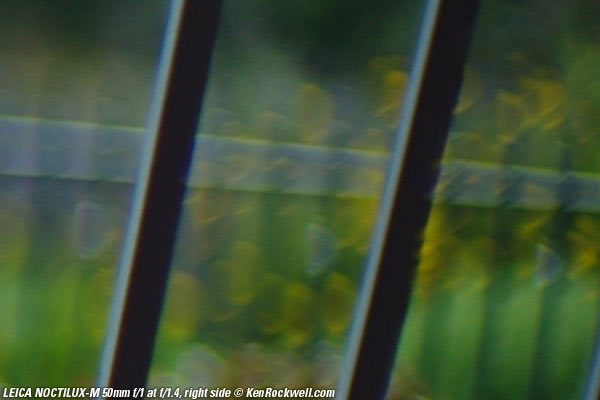 Bokeh top Bokeh, the quality of out-of-focus areas as opposed to the degree of defocus, is neutral in the center, and weird (poor) on the sides. Here are crops from images shot on the LEICA M9 and extremely enlarged to about 36 x 48" (100 x 150cm), or the equivalent of looking at LEICA M9 images at 100% on-screen. A vertically polarized phase lattice was set up at 3 meters (10 feet) on which the NOCTILUX-M was focused, and the synthetic reference vegetation seen out of focus in the background was at 15 meters (50 feet).