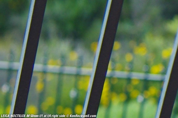 f/4: Finally: nice bokeh. Analysis top Bokeh is ho-hum in the center. It's not that great at f/1, and normal at smaller apertures. On the sides, bokeh is awful until you stop down to f/4 or so. If you have to stop down to f/4, then why did you buy a NOCTILUX-M? Bokeh looks the same at f/1 and f/1.4 on the sides because there is so much mechanical vignetting that the same amount of light gets through at each of these settings.