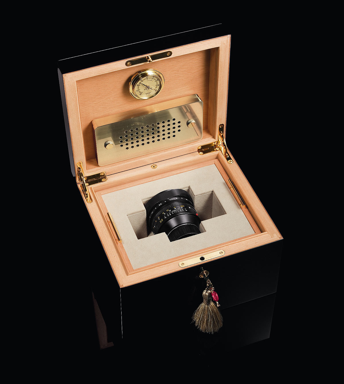 Die schwarze Holzbox geöffnet. Vergrößern.