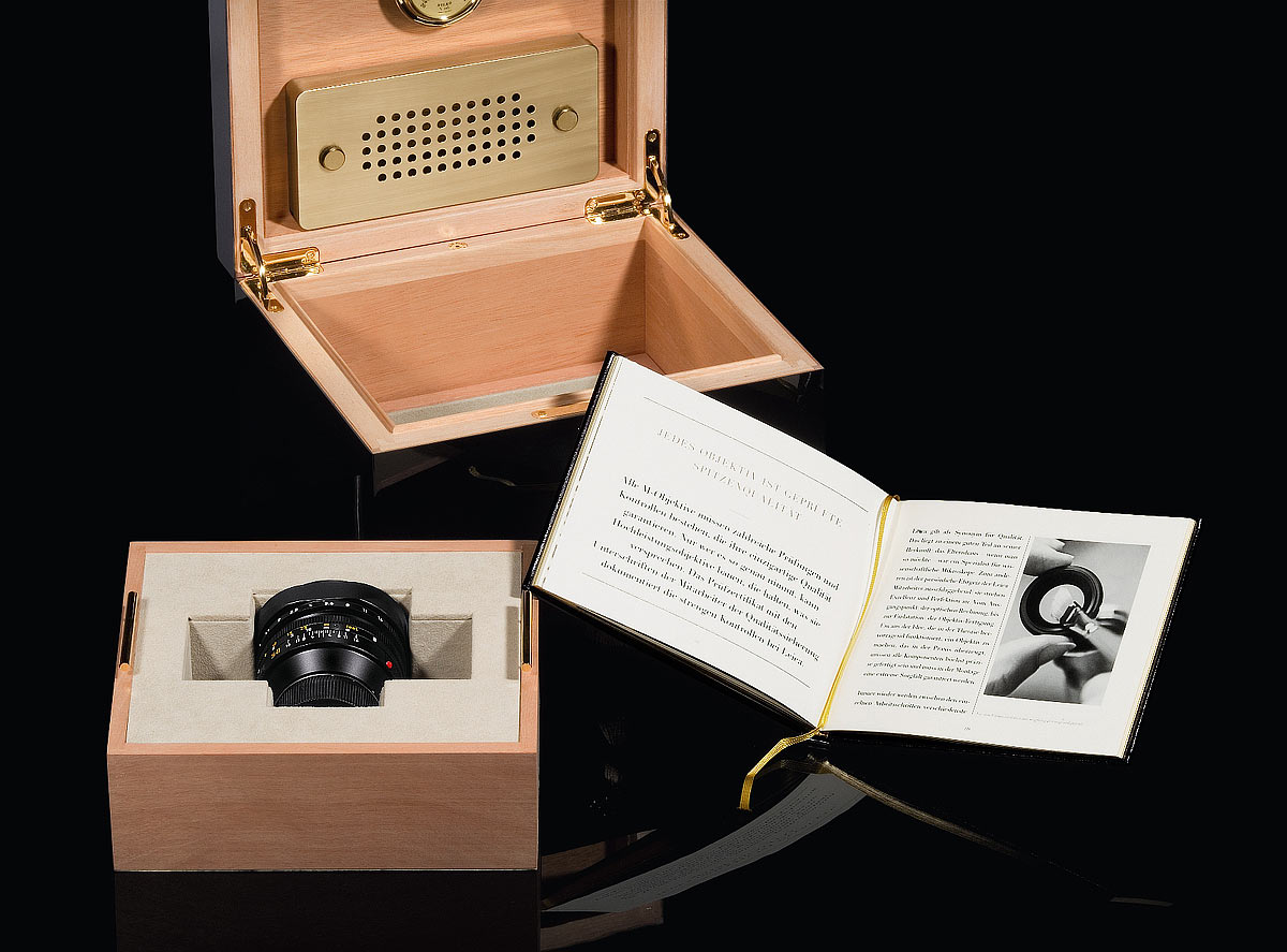 1993-2008: 11 822 (reviewed here) LEICA NOCTILUX-M 50mm f/1. E60 (60mm x 0.75mm) filters. Two-section telescoping hood. 20.612 oz. (584.3g). Front cap: 14 290. The cap is smart: you must remove it to extend the hood. Dimensions: 72.05mm square hood x 64.50mm extension from flange, hood retracted. 75.18mm with hood extended. At the end of production, Leica had sold its Canadian factory in which these were manufactured, and retained an arrangement where the new owners continued to make these for Leica. When the one guy there who knew how to make these retired, that became the end of this NOCTILUX-M. In Leica's words, "it needed a redesign anyway," and thus the 0.95 came to be. In first-klasse marketing fashion, Leica didn't tell anyone that there was a much better lens on the way. Leica merely announced that this classic was coming to a close after 30 years, and struck a commemorative edition! Die schwarze Holzbox. Vergrößern.