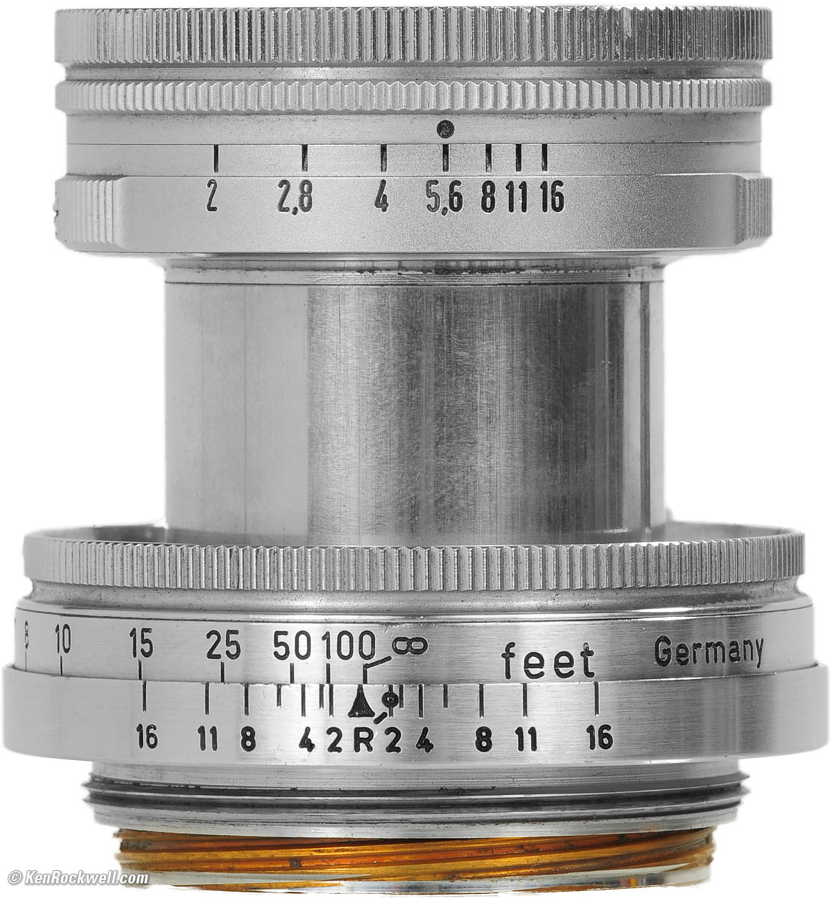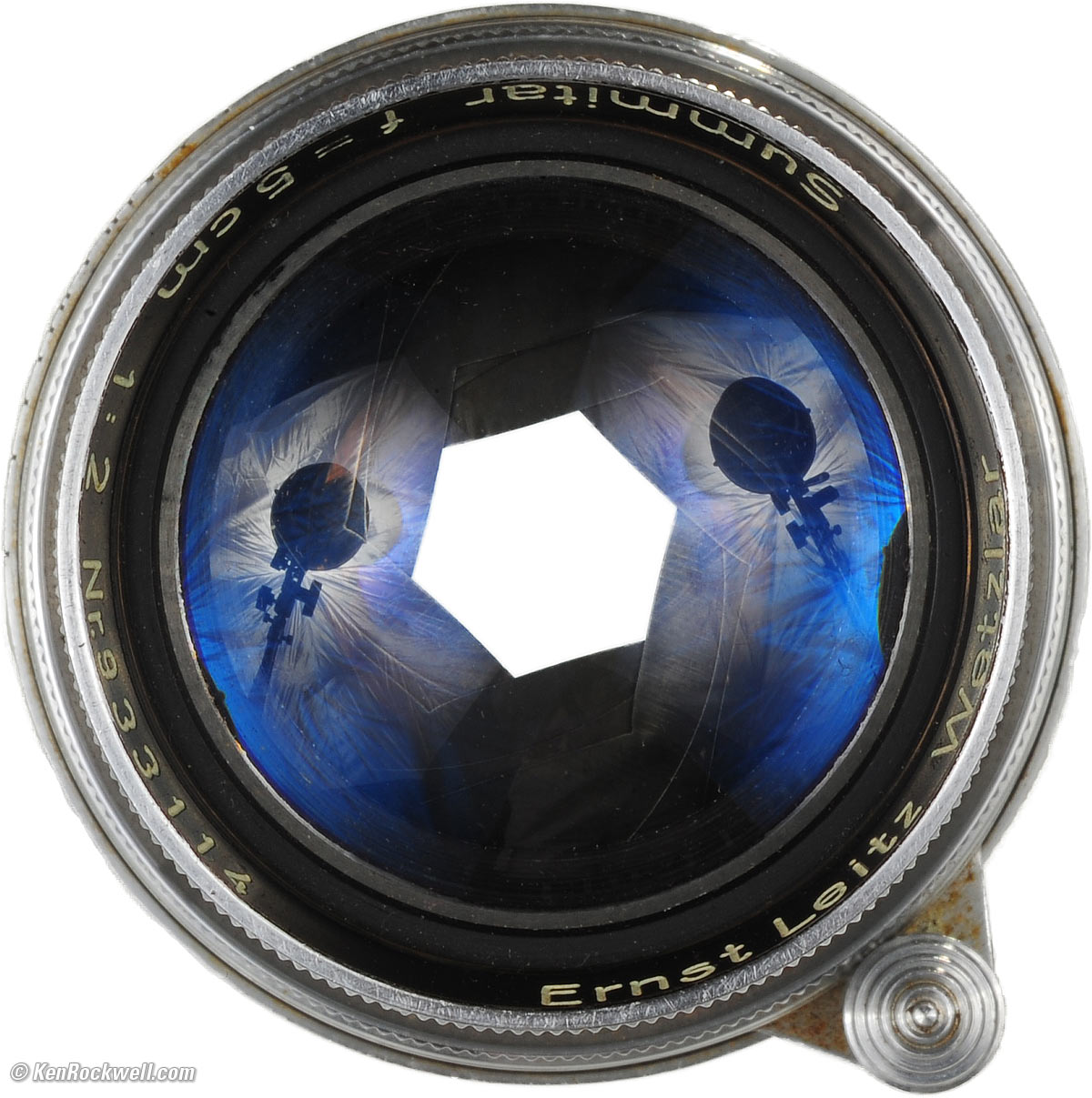 Optics top 7 elements in 4 groups. Herein lies the secret of the SUMMITAR's performance: most other 50mm f/2 lenses, like Nikon's 5cm f/2 for their contemporary rangefinder cameras, have never used more than 6 elements. Uncoated before WWII, then single-coated in blue from 1946.