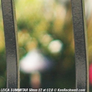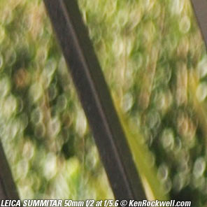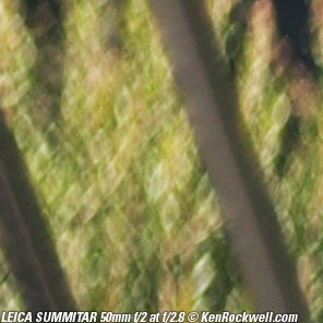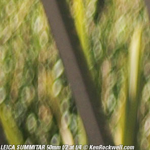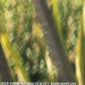 Bokeh performance top Bokeh, the character of out of focus backgrounds, not simply how far out of focus they are, is fair in the center, and downright weird on the sides. Here are crops from the center of 100% LEICA M9 images, focused on a reference phase lattice at 3 meters (10 feet) with synthetic reference vegetation at 15 meters (50 feet). Printed full-image at this size, these would be about 52 x 35 " (130 x 90cm) prints, at least as seen on most 100 DPI computer monitors. These examples with a 1950 SUMMITAR with a 6-bladed diaphragm. The earlier 10-bladed version will be the same, except that any slightly hexagonal blobs will be rounder with 10 blades. They will retain the same character. If you want great bokeh, you want the Zeiss 50mm f/1.5 C Sonnar ZM. Contrary to old wives' tales, lens designers back in the slide-rule and trig-table days of 1939 of this lens were happy to calculate a lens design that was sharp wide-open or sharp in most of the center of the image, and side sharpness was very difficult. Being able to optimize a design considering also bokeh just didn't happen; good or bad bokeh just happened, which is why the bokeh on the sides of old lenses gets so weird.