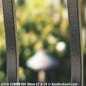 Sharpness performance top The more you know about photography, the more you know that lens sharpness doesn't matter. This SUMMITAR is as sharp in the center as the modern SUMMICRONs at every aperture, and just a teeny-tiny bit less soft in the center at f/2 than today's SUMMICRON-M. This means that even if you're shooting M9 DNGs and looking really close, the center sharpness will scare you. The sides are less sharp. This is this lens' character. If you want surgically-sharp sides, duh, shoot a new SUMMICRON-M. This SUMMITAR is sharp enough for most work today, and is a perfect example of why LEICA's lenses have always been held in such high regard. In its day, LEICAs had to compete in sharpness with the more popular 4x5" and 5x7" cameras shot by most people.