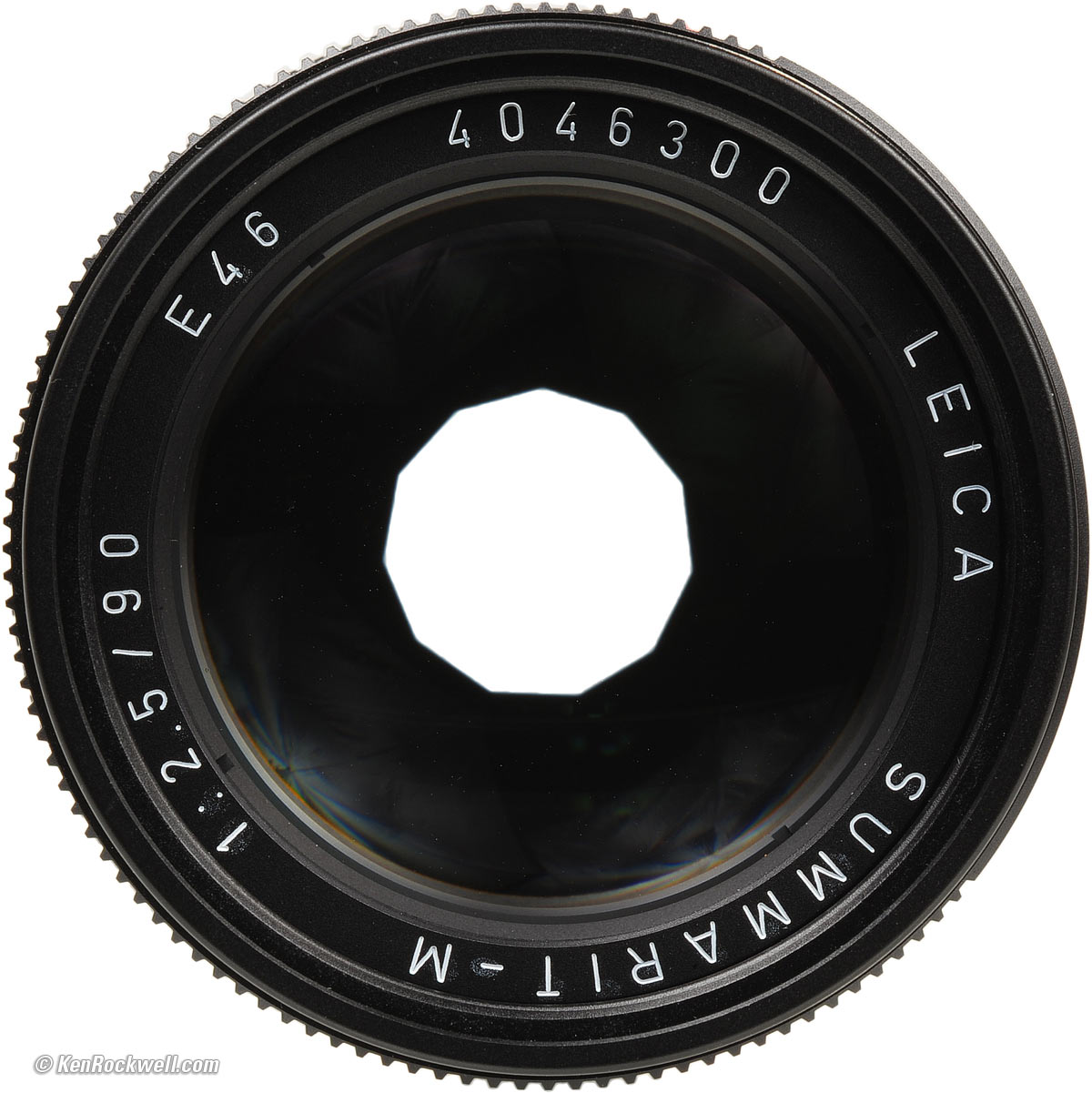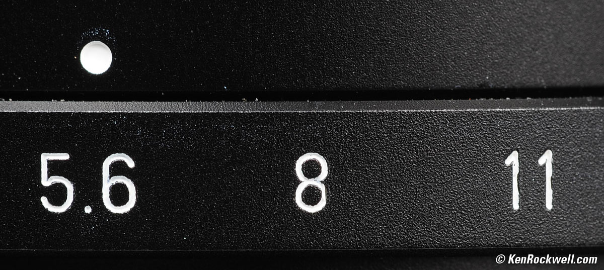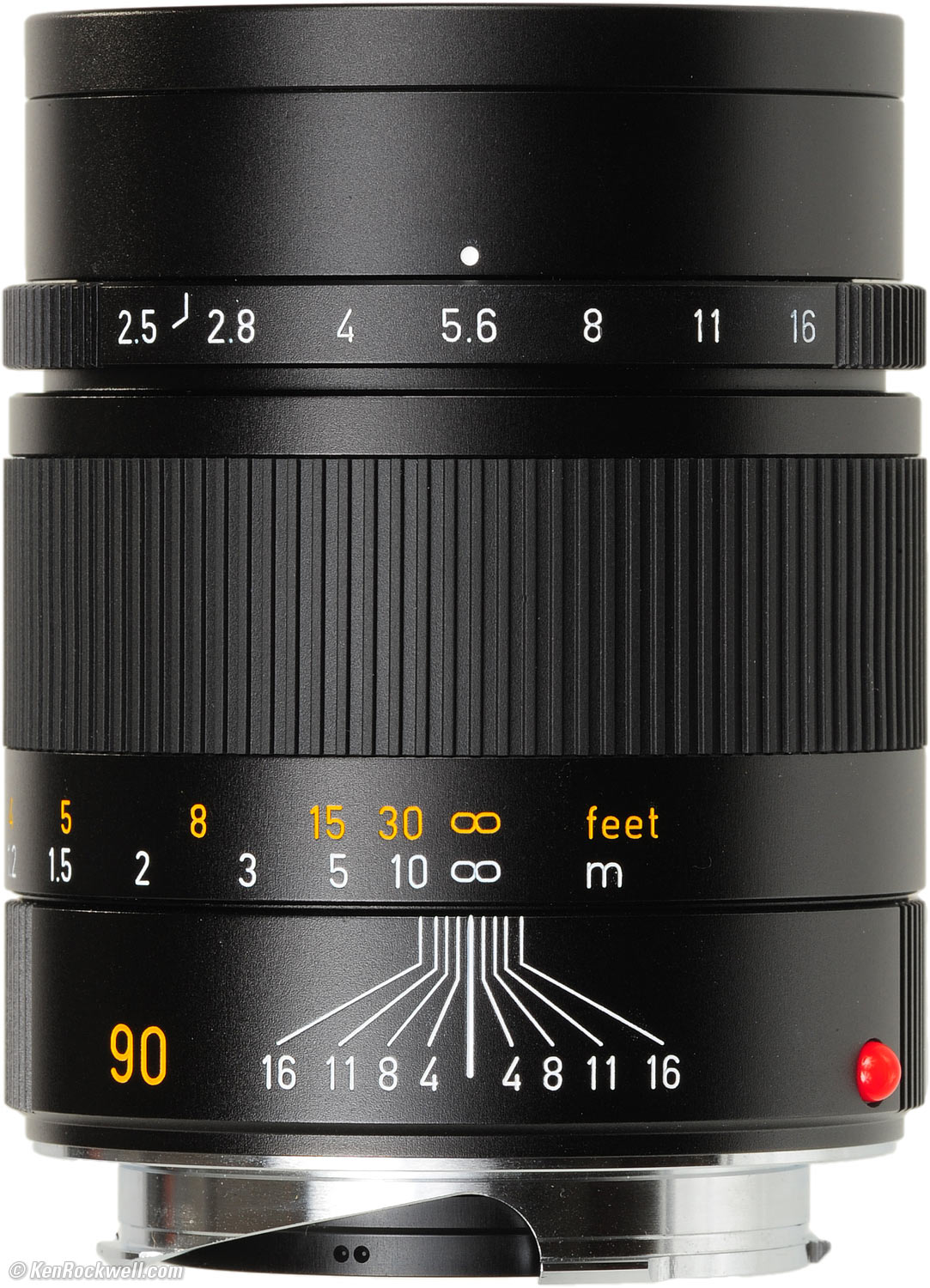 Diaphragm specifications top 11 blades. LEICA 90mm f/2.5 SUMMARIT-M at f/5.6. enlarge. Stops down to f/16 with half-stop clicks. While you're here, notice that the white paint wasn't completely removed from the parts of the lens around the lettering that are supposed to be black.