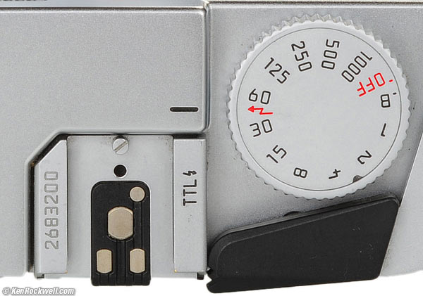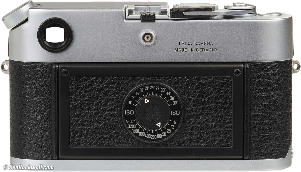 Basics See your printed M6 TTL User's Manual. It also applies to the M6. Push in the rear dial to set the film speed. LEICA says there's no need to worry about dirt, corrosion or care of the three gold ISO contacts visible when you flip up the film door. LEICA says keep the M6 and M6 TTL in the shade of your body as you change lenses, since direct sunlight could sneak around the shutter curtains and fog film. LEICA also warns not to leave the lens uncapped pointed at the sun, since you'll easily burn the black rubber shutter curtains with an f/1.4 lens wide-open. The LEICA M6 and M6 TTL are made to be used — a lot. If you just want to look at them, LEICA suggests firing the shutter at all the speeds and moving all the camera and lens controls every three months.
