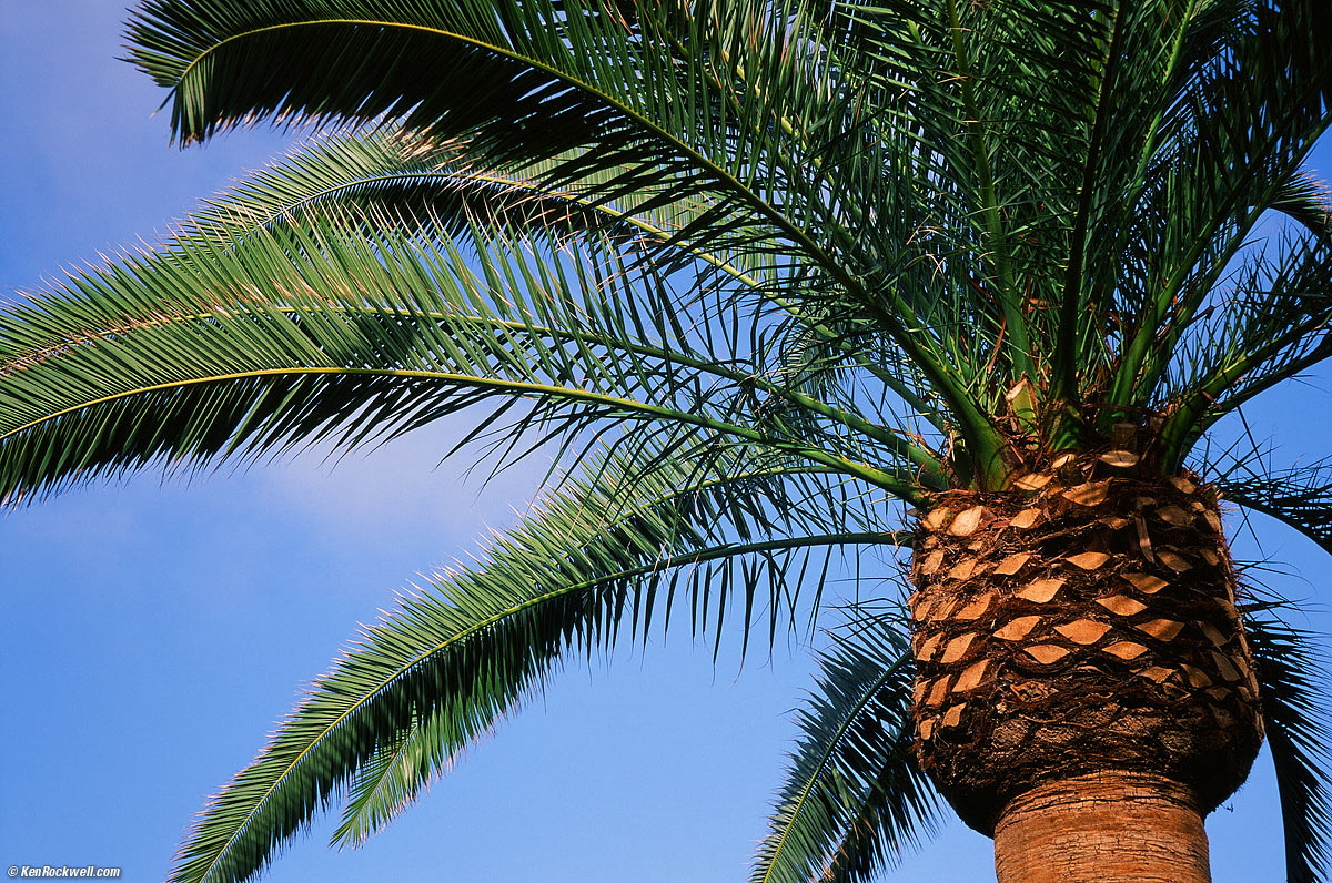 Hand-held on Velvia 50. Typical crappy exposure. Exposure accuracy is poor compared to other cameras. It's about what I'd expect from a below average point-and-shoot. It's poor because it's not simply a consistent error. Some images are over and others are under, and it will take a lot of experience to learn when and where it does this and be able to compensate for it ahead of time. It's more than simply following the Zone System for light or dark objects. Unlike with an SLR (or even a Nikonos IV), on which I can get 37 perfect slides on a 36-exposure roll, I only got 12 out of 38 on my first roll with this Leica. I got 35 out of 37 with my first roll in an N90s, for instance, and these were under tougher circumstances including time exposures at night. To get great results on slide film, you'll need to shoot a lot and develop a second sense of how and where to preset exposure compensation. I doubt anyone with this ability to work around light meter foibles would be using a camera like this, which means 99.9% of the people using the Minilux zoom are in for iffy exposures. From what I see, most people who shot Leicas shoot print film, for which this isn't that important. If you shoot prints, and if the dark and shadow parts of your pictures are muddy or gray instead of sharp and black, you're getting underexposure. Flash exposure is even worse. It will cheerfully underexposes a good percentage indoor flash shots, even if they're in range. Be careful: flash range is often only a couple of feet. Fill-flash is also iffy. At the close focus distance in daylight at ISO 50, it overexposed. Lens Sharpness Palm. Fuji Velvia 50. enlarge. Lens sharpness doesn't matter if the focus, exposure or color is off. If you get those right, the lens is almost as sharp as SLR lenses. I compared it directly to a Nikon 35mm f/2D, but a significant percentage of the Leica's shots weren't precisely focused. The Nikkor lens on an F4 SLR was always in perfect focus with perfect exposure, and was sharper in the corners. The 35Ti is far better, since it never misses focus or exposure. The 35Ti and the Hexar both read-back focus distance, so you know as you shoot if focus is in the ballpark. Lens Cap What was Leica thinking when they forgot to put a little sliding door to cap the lens automatically like every other point-and-shoot? Even the Nikon 35Ti and 28Ti have solid titanium doors that slide over the lens when its retracted. Leica was thinking about warranty issues. Sliding doors (and retracting lenses) are the first things to break in any camera. It's so common that I don't mention in my reviews that many of my Casio, Canon, Fuji and every camera with one of these eventually break. What happens is that crud eventually accumulates, and the little leaves of these covers get stuck halfway open. When they won't open all the way, you have to bang on them or send the camera out for a repair that usually costs more than the camera. It's a pain to have to deploy a lens cap with this Leica, but I don't fault them for skipping the stupid little lens blind all together. Of course the motorized lens will die just like on all the other cameras, but at least without the blind there's one less thing to break. Color Rendition and Filters Awful. There are no filter threads, so the only way to use filters is to hold them in front of the lens and hope the light meter on the body sees through the filter and not your finger. Since there is no exposure readout, there is no way to tell. As a film camera, filters are mandatory to get the right colors. Even the master photographic artists who brag that they create their work "without filters" parenthetically explain "except for normal filters needed to balance the prevailing light conditions." I shoot thorough an A2, 81A or 812 filter all the time to get the look I want from Fuji Velvia 50. With no filters, the results are too cool for me. The Nikon 35Ti and 28Ti can't use filters either, but the Konica Hexar can. Even Nikon's first L35AF takes filters, but if you want to do serious photography, it's not easy with this Leica. Finder Hideous. It's tiny and cramped. If more people looked through the finder before they bought these, far fewer of them would have been sold. It is one-half as wide (one-quarter the area) as the finders of either the Nikon 35Ti or Konica Hexar. Flash Recycling is slow. Its rated for 6 seconds, and in actual use, I found myself having to wait for the red LED to stop blinking to be ready for the next shot. Only the cheapest point-and-shoot digital cameras today are this bad. Even inexpensive digital point-and-shoot cameras recycle much faster. External Flash There is an external flash shoe, but wait — there are no exposure controls on the Minilux Zoom! Sure you can pop on any flash, but God bless you if you figure out how to set the exposure for anything other than the dedicated Leica CF Compact Flash. The internal flash shuts off when a flash is slid in the shoe. The included black plastic hot shoe cover has a special cut-out on the right so that it doesn't cancel the built-in flash. Leica Minilux Zoom with Leica CF Compact Flash. enlarge. I borrowed the little dedicated flash along with this Minilux Zoom. I didn't bother to try it, since the camera already has a flash. When inserted, the bigger flash cancels the built-in flash. The camera makes the external flash fire at full-power for every shot regardless of the setting on the back of the external flash. The Minilux expose accordingly. The cameras's red finder LED supposedly follows the state of the external flash. There is no red-eye mode with the external flash. If you have it set, it cancels. If you consider the added size with the separate flash, it becomes bigger than a real full-featured camera, like a Nikon N55 or D40. Worse, there's no elegant way to carry the Minilux Zoom with the flash attached. There's the dainty wrist strap; but do you want this whole thing hanging off your wrist? To put it back