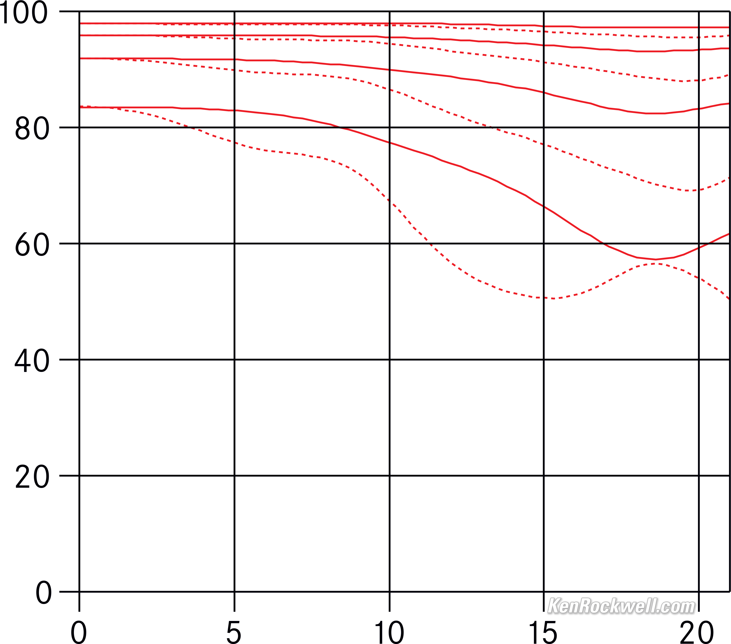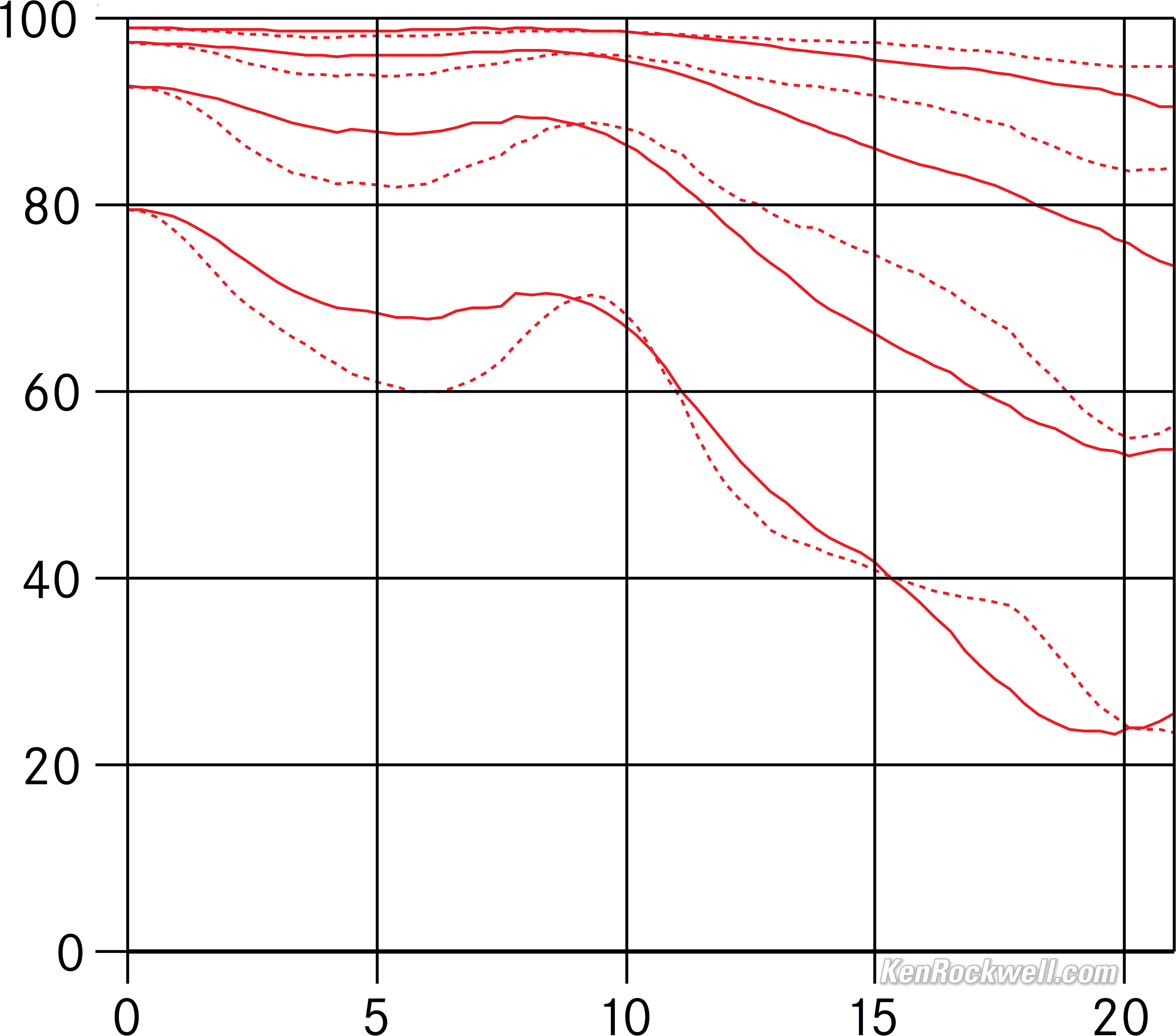 Modulationsübertragungsfunktion (MTF oder Modulationsuebertragung)LEICA's Modulationsuebertragung confirm that it's a little softer on the sides wide-open. These are measured with white light at infinity at 5, 10, 40 und 40 line pairs per millimeter. The solid lines are the sagittal (radial) and the dotted lines are the meridional (tangential) measurements: Modulationsübertragungsfunktion bei f/1.7. größer.