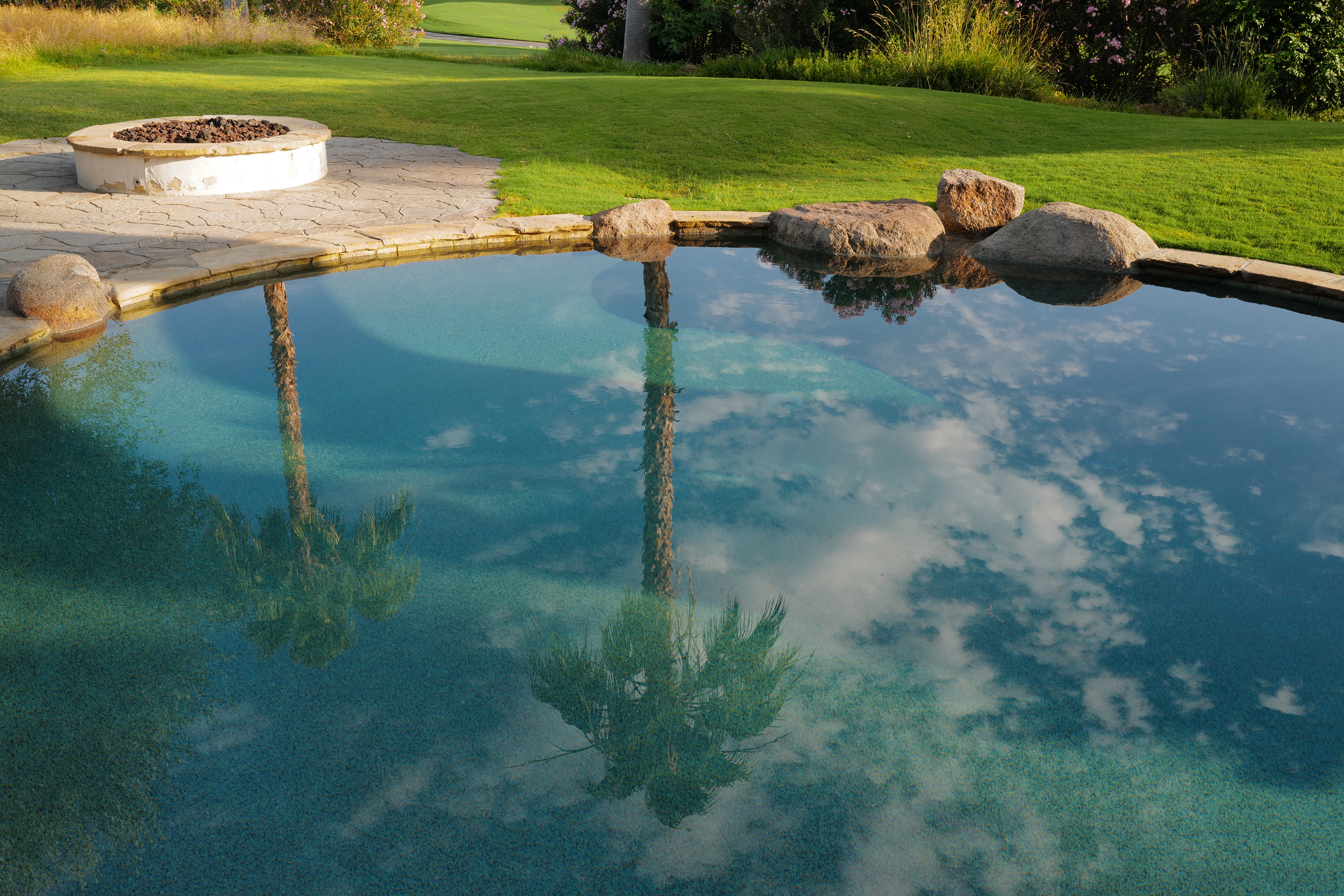 Palm Tree Reflexion im Wasser, 7:12 AM, 03 June 2020. LEICA Q2, LEICA SUMMILUX 28mm f/1.7 ASPH, 35mm (30 MP) crop mode, at f/8 hand-held at 1/60 at Auto ISO 100 (LV 11.9), exactly as shot. größer or camera-original 13 MB, 30 MP © JPG file.