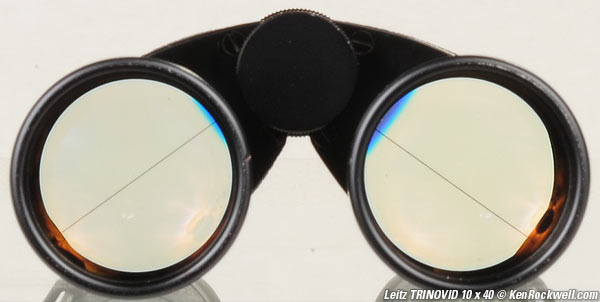 Brightness top People who talk about binoculars all day are always freaking out about brightness. Brightness is really just the light transmission, coupled with the exit pupil. I can't see that these are any different than the newest premium binoculars as far as brightness. As a comparison, let's look through both and see what we can see, as compared to a LEICA 8 × 42 BN. Roll your mouse over to compare: TRINOVID transmission comparison: 10 × 40 versus 8 × 42 BN. (mouseover) Each transmits at least 90% of all light. I don't see any significant difference. In photography, the smallest significant exposure difference is about a half of a stop, which would be the difference between 70% and 100% transmission. The lines seen in the 10 × 40 TRINOVIDs are the special Uppendahl prism arrangement. These lines aren't visible in the image seen through the eyepieces, nor do they cause any smears on points of light. The color fringes seen are artifacts caused by me making these photos from only 3 meters (10 feet) away, and thus seeing through the corners of each of the narrower fields of view of these higher-powered 10x40s. I'm not looking through their centers. The fact that each is fully illuminated shows us that both of them aren't cheating and using cheap prisms, as happens with drug-store binoculars. In both these cases, were getting the full brightness of the entire objective lens.