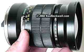 Specifications It has six elements in five groups. It is 3.8" (96mm) long by 2.8" (70mm) around and weighs 18.3 oz. (520g). It focusses to six feet or 1.8m. It has a metal 67mm filter thread. It has a five-bladed diaphragm stopping down to f/32. The bayonet plastic lens hood is included, so don't buy a used lens without the hood.