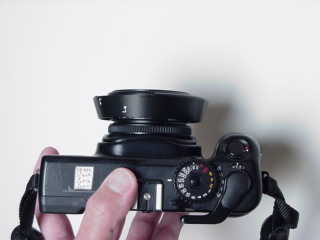 Screwy Options Closeup Attachment Just like the panoramic options, pass on the corny closeup contraption. A used close-up attachment is worth about $100. I had one for my 6 and sent it back. It only gets you a little closer and is a real pain to carry around and still you are composing from the wrong point through a rangefinder. I get much better results just cropping from the big film and not bothering to carry this contraption around! It's just a close-up lens and a prism for the finder. You also can buy your own high-quality close up lens for cheap (get the two element Canon or Hoya versions) and bring some string to measure the distance. Optical quality was poorer than just blowing up from the center; it's just a close up lens, not an extension tube or dedicated macro lens. That's why these are so rare; no one bought them because they sucked. The only use is if you want to project your transparencies for conventional slide shows and prefer a softer image that fills the film, otherwise save yourself the hassle and blow it up if you need to in scanning and printing. No rangefinder is good for closeups. A pocket digital camera still works better.
