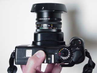 Light Meter The light meter is an averaging meter that reads the light coming through most of the viewfinder's area. That means that you have a mild center weighting with the wide lens, no weighting with the normal lens, and read outside the field of view with the telephoto lens. This can be adjusted a little bit by the factory with baffles inside the viewfinder and metering system. I wish it was a little more center weighted. See tips below. The Mamiya 6's averaging meter is completely different from the Mamiya 7's spot meter. Mamiya's literature and Mamiya USA's salespeople who read this literature are mistaken here. Go try for yourself as I do and see. It is extremely sensitive and accurate and can be tricked into making accurate measurements into the minute range. See the tips in the next section. Mamiya makes me laugh. They list different relative angles of view for different lenses. This is because the metering area remains the same but the lens' angle of view is changing! I only use the meter in AEL or A mode, in which case it is effectively stepless. The built-in meter is sort of useless in manual mode because it only reads to full stops. Unlike every other manual meter, there is no "0" or null indication to show you the correct exact exposure. Because of this you may be off as much as a half stop and not know it. This is critical for slides, unimportant for negatives. You ought to wiggle the aperture ring in manual mode and use the aperture setting in the middle of the range over which your chosen shutter speed is indicated. As most cameras, manual shutter speeds go in full stops and lens apertures are continuously variable.