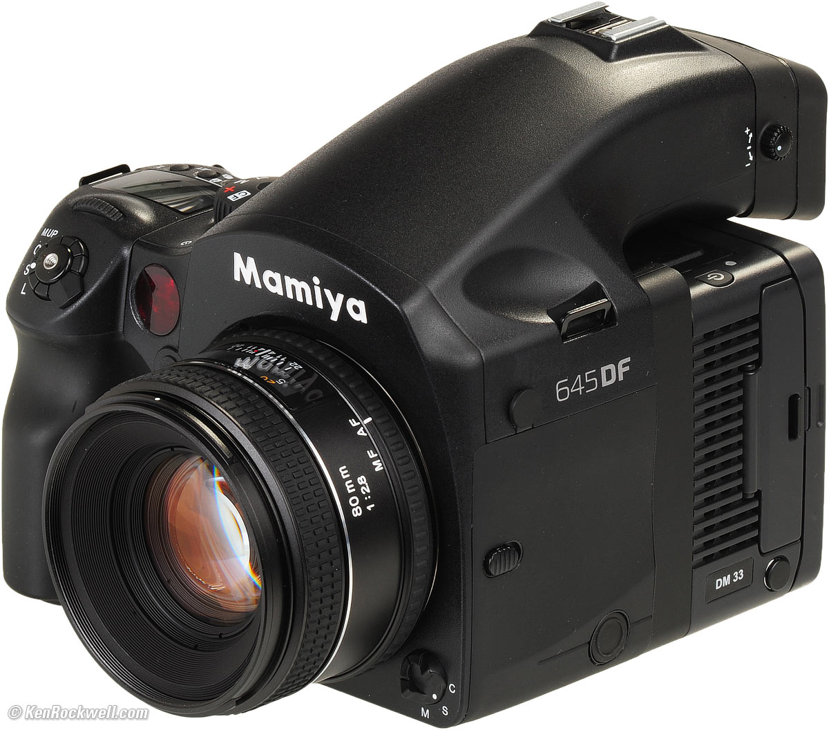 Price top The Mamiya DM33 comes either as a complete camera, as shown with 80mm f/2.8 lens for $20,000, or as the digital back alone, for $18,000. I am reviewing the complete camera system. The Mamiya DM33 is a big professional camera intended for studio and very serious field professionals. The 645DF body has no RealRaw capability. For that, you need an older model 645AF body.