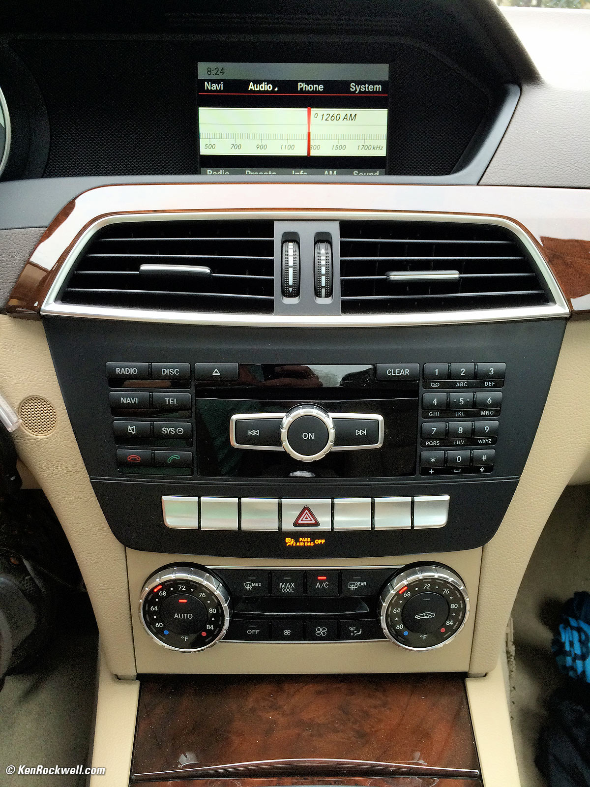 Center stack, 2014 Mercedes C250 Sport. enlarge. It uses the same switches as every other current Mercedes. The radio display is a smaller screen than on larger models. It's easy to tune by feel, but you have to pull over to look at the screen to change from AM to FM.