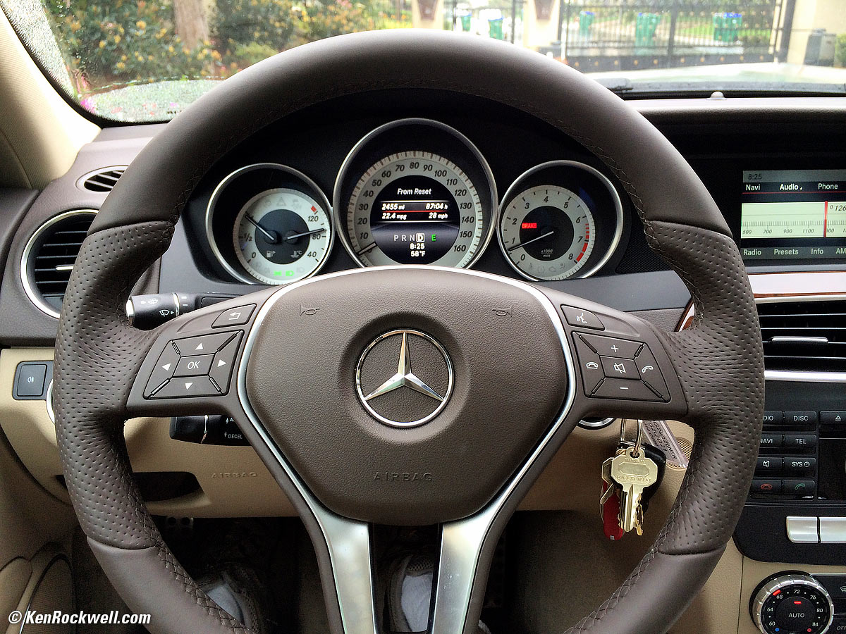 This car here is the Sport model, which is usually less plush than the Luxury version with the star on the hood. Even this Sport model is very smooth and quiet! It's a solid, nimble, fast, comfortable and well-made car. The 1.8 liter 4 cylinder turbo engine is powerful, but with only 4 cylinders, a bit of a chugger at idle. There is leather and wood all over. The seats are Mercedes classic MB tex, a magic material as comfortable as leather but more durable than life itself.