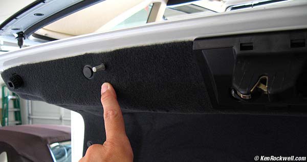 E430 Trunk E430 Trunk Light Switch (roll mouse over to see a trick) Trunk Light Trick Pull out the little switch to turn off the light. You can leave the trunk open all the time without running down the battery. This saves me from having to close the trunk every time I return home, and then open it again to load before leaving. Center Console Release Switch and Light
