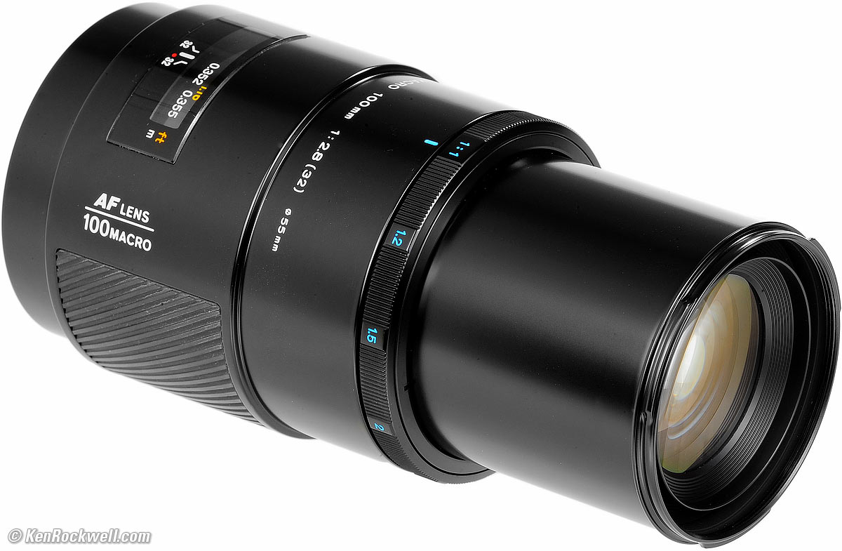 Sony 100mm f/2.8 (same optics, sold 2006-today) Nikon 100mm f/2.8 VR (2006-today) Nikon 100mm f/2.8 AI-S (1983-today) Nikon 100mm f/2.8 AF-D (1990-2007) Canon 100mm f/2.8 IS L (2009-today) Canon 100mm f/2.8 USM (1990-today) Introduction top Intro Specifications Performance Recommendations This Minolta Maxxum AF 100mm f/2.8 is a macro lens for all Minolta MAXXUM and Sony Alpha cameras. It is insanely sharp and has the lowest distortion I've ever measured in a macro lens: zero at every distance! Used on today's Sony A99 it has image stabilization and ultra-fast autofocus. It does the same thing as Sony's 100mm f/2.8 Macro for less than half the price. The Minolta 100/2.8 is the world's first 100mm autofocus macro lens, introduced a year after the world's first AF SLR, the Minolta MAXXUM 7000. This is also the world's first 100mm lens that can focus directly to life-size (1:1) without adapters. It took Canon and Nikon each four years to catch up, in 1990! The all-metal Minolta 100mm f/2.8 works perfectly on today's Sony A99, except that the AF-D Depth Map AF (whatever that is) and the automatic lens corrections don't work. So what, the images look fantastic and everything else works, like face recognition and all the focus modes including Direct Manual Focus (DMF) override, so all is well. It's all solid alloy and much better made than Nikon's similar 105mm f/2.8 AF Micro. which didn't come out until 1990. This Minolta 100 2.8 Macro has an all-metal exterior, metal mount, metal focus ring, metal filter threads, and an all-metal barrel. The only plastic is the focus window, the red mounting dot and the rubber grip. This is a full-frame lens for 35mm film and full-frame digital, and will be reviewed thusly. Feel free to use this on cropped-frame cameras, too, on which it will give even closer apparent results.