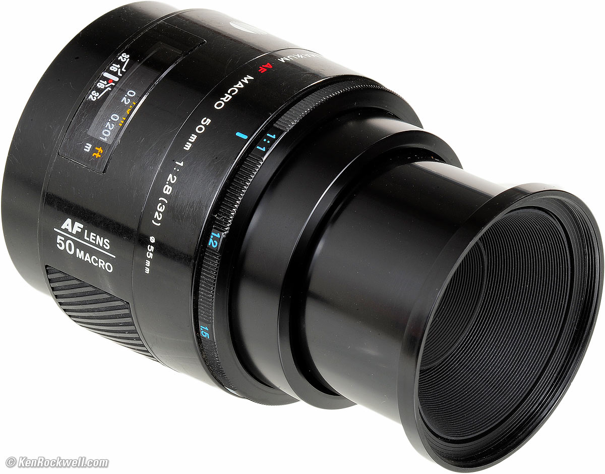 Recommendations top Intro Specifications Performance Compared Recommendations I bought this Minolta 50mm f/2.8 for my Sony A99 for use as a normal lens. For a 50mm lens for MAXXUM or Sony, we have three choices: the 50mm f/1.7 MAXXUM lens, the f/1.4 lenses or this f/2.8 macro. This macro focuses much faster and closer than the others, and none of the others is sharper. If f/2.8 is fast enough, then I'd get this macro instead of the faster lenses. For digital Sony cameras, since their Auto ISO and Program modes tend never to shoot any wider than f/4 even in very dim light, you won't be using the extra speed of the other lenses, so get this macro instead for faster and closer focusing. For use on 35mm MAXXUM cameras, the f/1.4 is probably best, as you'll need the extra speed on film, and the MAXXUM program modes properly use the largest apertures. For dedicated macro use, 50mm lenses are a bad idea because you have to get too close to the subject. You block your light and annoy live subjects. Get the MAXXUM 100mm f/2.8 Macro or Sony 100mm f/2.8 Macro instead. If you've found the time, effort and expense I incur researching and sharing all this information for free, this free website's biggest source of support is when you use this link to get yours at eBay as I did, or use or any of these links when you get anything, regardless of the country in which you live. Please always use these links when getting any of your gear so I can continue to share what I know for free — because I receive nothing for my efforts if you buy elsewhere. I'm not NPR; I don't get any government grants or have annoying fund drives to help me research and give all this information away for free. Thanks for your support! Ken.