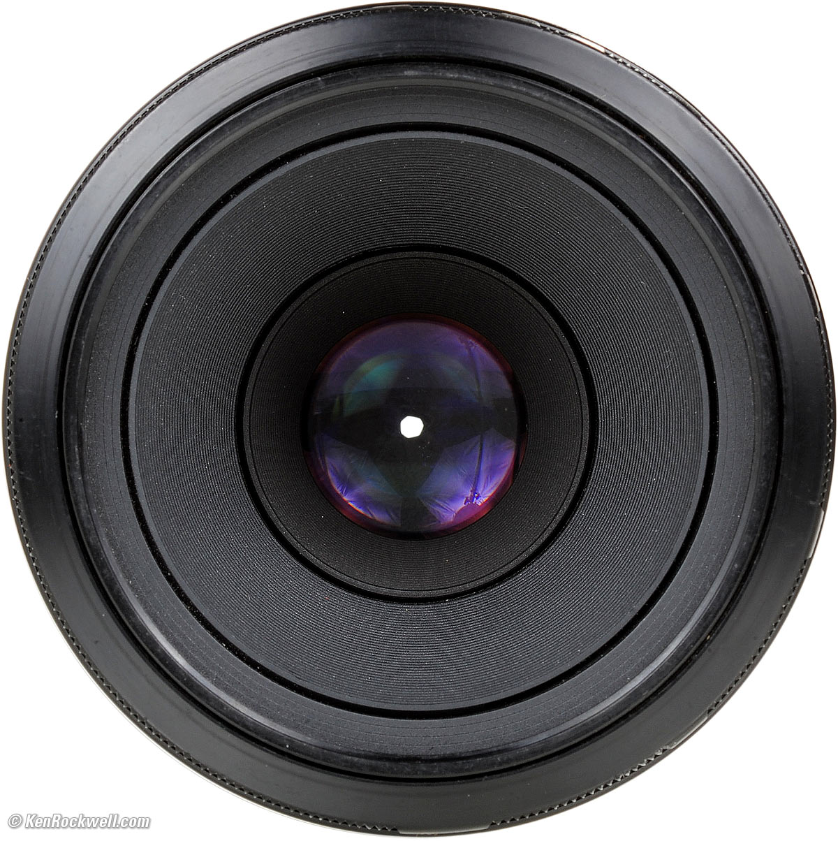 Diaphragm top Minolta 50mm f/2.8 at f/32. bigger. 7 straight blades. Stops down to f/32. Non-compensating system. We lose 1-2/3 stops of light at 1:1, and the camera still tells us that this is an f/2.8 lens — even though it's really only an f/5 lens at 1:1.