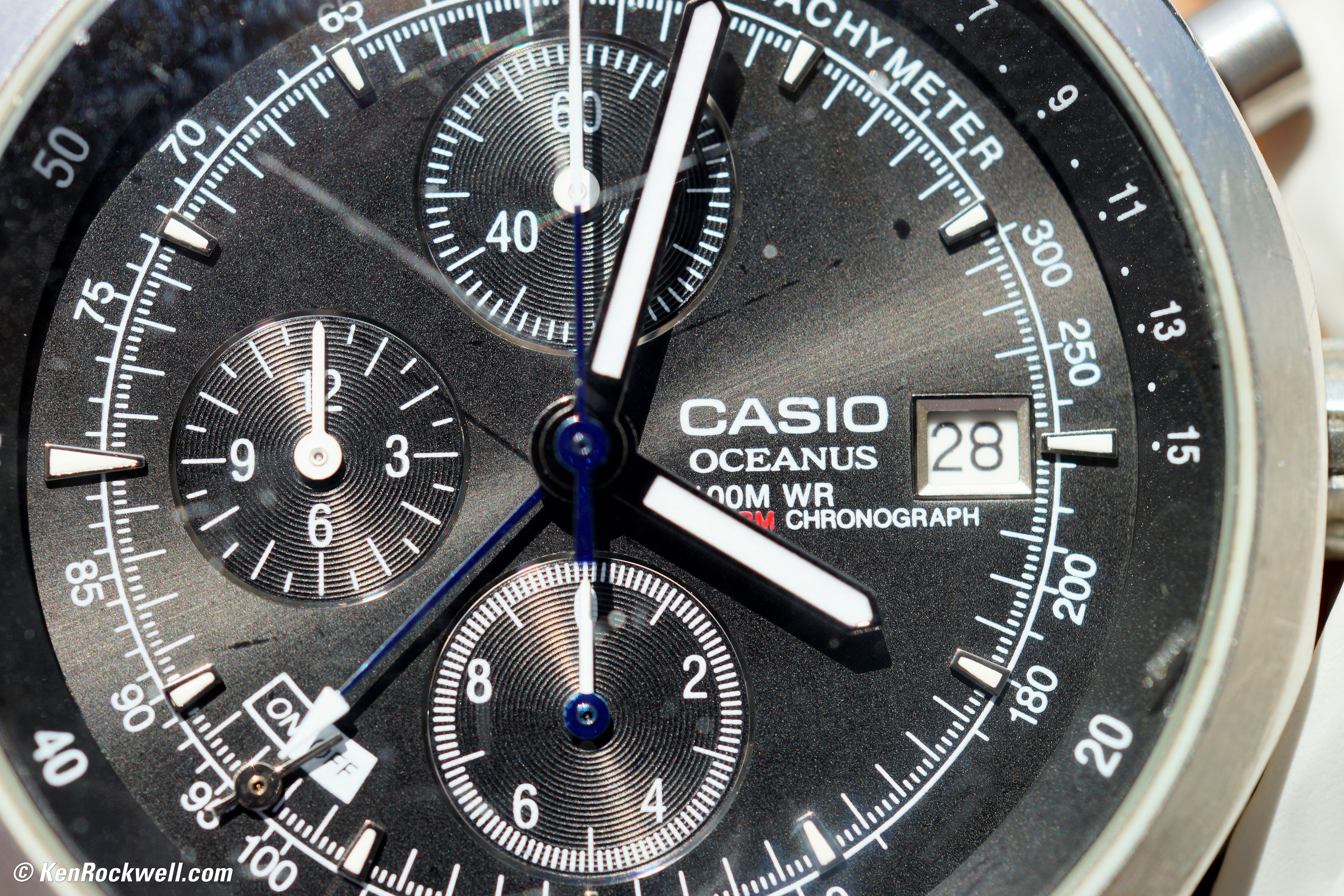 Casio Oceanus at 1:1. (Sony A99, Minolta MAXXUM AF 50mm f/2.8, f/5.6 at 1/160 at Auto ISO 100.) Full-Resolution. Note: the curved watch crystal degrades the image of the watch face.