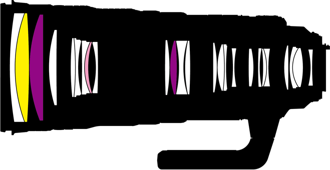 Nikon 120-300mm internal optical construction. ED, Fluorite and SR elements. 25 elements in 19 groups. 1 ED extra-low dispersion elements, which help reduce secondary axial chromatic aberration. 2 Fluorite elements for extreme sharpness. 1 SR (Short-wavelength Refractive) glass element to reduce spherochromatism. Nikon Super Integrated multicoating (SIC), Nano and ARNEO anti-reflection coatings. Fluorine front element coating to resist dirt and smudges.
