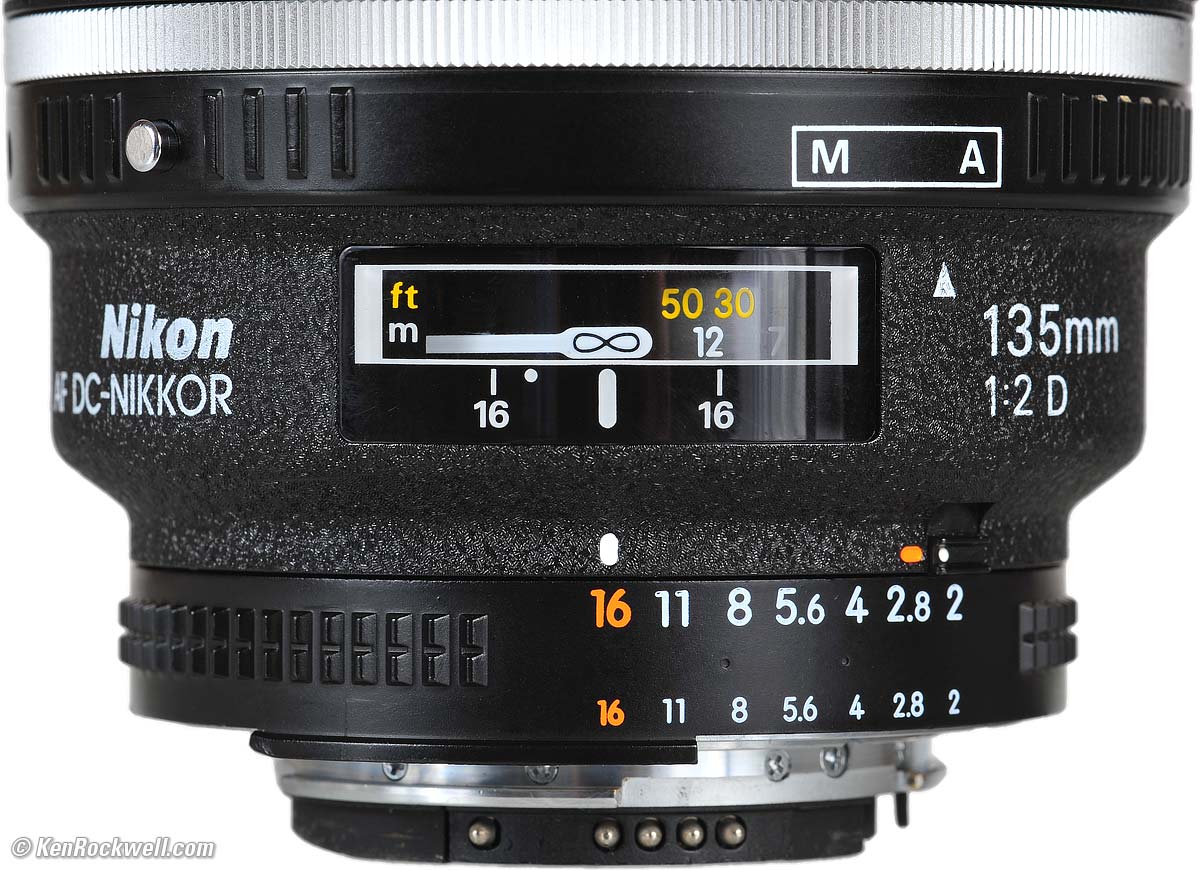 Focus Nikon 135mm DC Focus Controls. bigger. When you set the Defocus Image Control away from zero, the focus shifts. Be sure to focus after you set the Defocus Image Control (DIC). That's why the ∞ mark has a white band slopping off to the left: with the DIC set to optimize defocus behind the subject (R), infinity comes up along that bar. With the DIC set towards F, infinity comes up closer on-scale distances. Don't sweat this; this is how the optics recombobulate themselves for optimum performance. If you're an engineer and aren't getting this, leave the DIC at zero. To switch between auto and manual focus, press the unlocking button on the left, and rotate the AF Mode selector between M or A. For use on most Nikons made since the 1980s where aperture is set or controlled on the camera, be sure to set the aperture ring to 16, otherwise you'll see a blinking " fEE" message. There's a sliding lock to keep it set at 16, just above the 2 in the photo above. Nikon 135/2 DC. bigger.