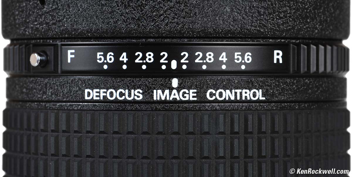 Defocus Control DC stands for Defocus Control. A lot got lost in the translation on the way from Japan. The key word is control, not defocus. This is not a soft-focus lens; it is a lens that has been specifically designed and patented both for superior bokeh (the softness of out-of-focus areas), and the ability to control this bokeh for optimum results under all conditions. Defocus Image Control. bigger. How do you set this 135mm lens for optimum bokeh? Easy: set this ring to the same aperture at which you're shooting. Press the unlock button on the left in order to move it, otherwise it stays locked. Set it to the R side to make backgrounds go soft and disappear, or the F side if you want to optimize it for junk in the foreground. Hint: You should almost never have out-of-focus objects in front of your subject or in the foreground. It looks unnatural and weird. Our eyes naturally focus on the closest thing to us, so it's uncomfortable when a photo has a soft foreground or other distractions which our eyes can't bring into focus. The effects of this defocus control are very subtle. You won't see it through your viewfinder. When used properly, the 135 DC turns backgrounds into the softest, smoothest washes of color you've ever seen. Turn the ring in the wrong direction, and out-of-focus backgrounds get harsher. These are subtle effects. Computer people may not see these subtleties at all, but artists will. Leave the Defocus Image Control ring at zero, and the 135 DC simply acts as the sharpest 135mm lens you've ever used. The defocus control only controls defocus, or the parts of the image that are not in focus. If you set the control beyond the aperture you're using, like set to f/5.6 when shooting at f/2, you can get a softer focus effect. The in-focus part of the image is always ultra sharp. This is not a soft-focus lens. It's only the unfocused parts of the image which are made softer. No one in the USA understands this lost-in-translation subtlety, and mistakenly thinks this is a soft focus lens. That's why this lens isn't popular in the USA. The 135 DC has a control for all of this. This is why Nikon has the patent on it. You can adjust the lens from normal to super bokeh to soft focus if you push it too far. You'll notice that dedicated soft-focus lenses have no separate defocus control; they are fixed one way and the only control you have is your shooting aperture. This lens is so unique that Nikon will probably discontinue it just around the time people start figuring out what it does, and then the used price will skyrocket to $4,000, just like it did with the 28mm f/1.4, for exactly the same reason.