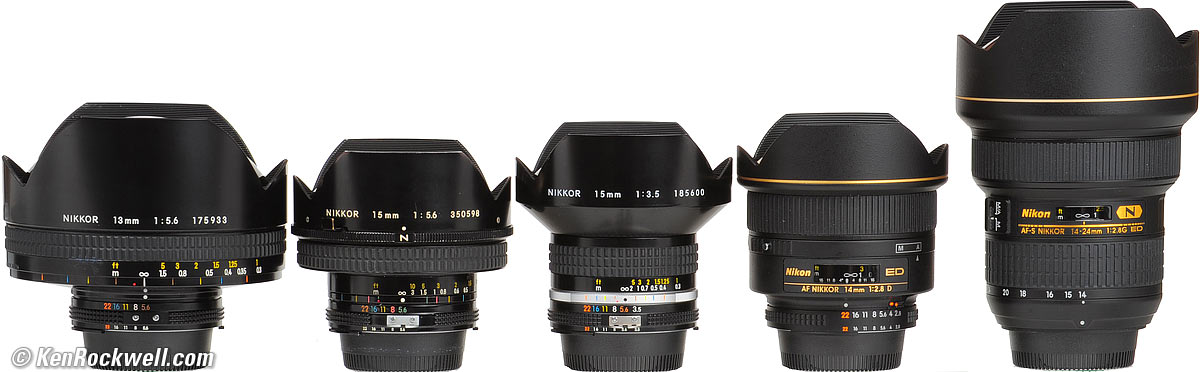 Size Comparison among all other Nikon ultra-ultra wide lenses. enlarge. Nikon 13mm f/5.6, 15mm f/5.6, 15mm f/3.5, 14mm f/2.8 and this 14-24mm f/2.8.