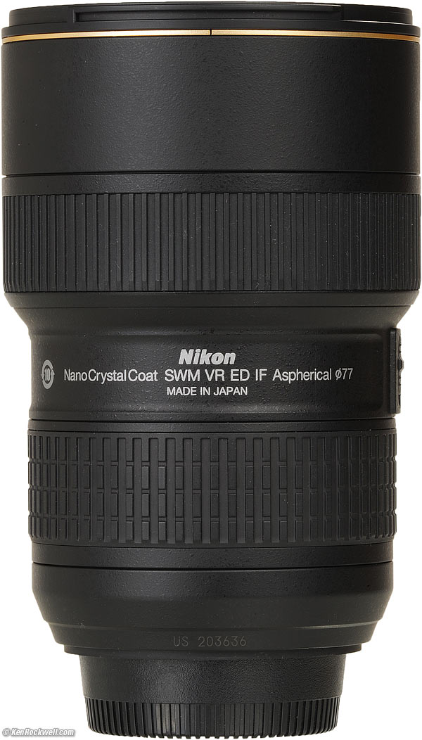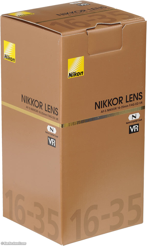 Bottom, Nikon 16-35 VR. I 'd get my 16-35 VR used at eBay (How to Win at eBay). This 16-35mm is the sharpest and best-handling Nikon ultrawide zoom ever made for DSLRs and 35mm SLRs. f you shoot FX, or 35mm on a modern camera, get one of these 16-35mm lenses today. It's my favorite Nikon ultrawide. It's slightly sharper than the 14-24mm, adds VR, uses normal filters and is smaller, lighter and less expensive. Turn VR off in daylight, since it increases shutter delay. The huge 14-24mm is a special-purpose lens. I don't suggest it for general use; I suggest this 16-35mm. Skip this full-frame 16-35mm for DX. The 10-24mm DX or 10-20mm are much better for use as wide-angles on DX and cost much less. If you're a backpacker, the 18-35mm AF-S or 20mm f/1.8 weigh less, but have no VR. I never use the hood. I leave it in the box for resale time. I'd leave either a 77mm Nikon Clear (NC - UV) filter or a 77mm Hoya multicoated HD3 UV, which uses hardened glass and repels dirt and fingerprints, on the lens at all times. For less money, the B+W 77mm 010 is an excellent filter, as are the multicoated version and the basic multicoated Hoya filters, but the Hoya HD3 is the toughest and the best. Filters last a lifetime, so you may as well get the best. The Hoya HD3 stays cleaner than the others since it repels oil and dirt. I 'd get my 16-35 VR used at eBay (How to Win at eBay). This all-content, junk-free website's biggest source of support is when you use those or any of these links to approved sources when you get anything, regardless of the country in which you live. Nikon does not seal its boxes in any way, so never buy at retail or any other source not on my personally approved list since you'll have no way of knowing if you're missing accessories, getting a defective, damaged, returned, store demo or used lens. I use the stores I do because they ship from secure remote warehouses where no one gets to touch your new camera before you do. Buy only from the approved sources I use myself for the best prices, service, return policies and selection. Thanks for helping me help you! Ken Rockwell.