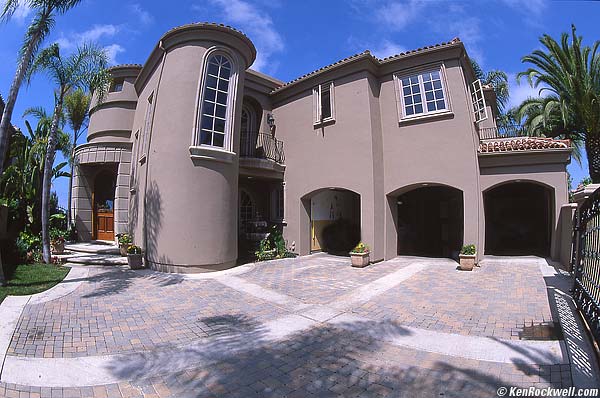 For DX digital cameras get the 10.5mm DX fisheye instead, since on DX digital cameras this 16mm fisheye only gives a partial effect. On a DX digital SLR you only get a half fisheye effect. To correct this to rectilinear use Photoshop CS2's lens distortion correction twice, each pass at +100 for distortion and +150 for size. This gives you: