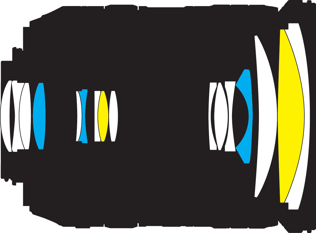 OpticsSchematic diagram. Blue: aspherical; yellow: ED. enlarge. 16 elements in 12 groups. Two are ED glass. Three are aspherical. Nikon Super-Intergrated Coating (SIC).