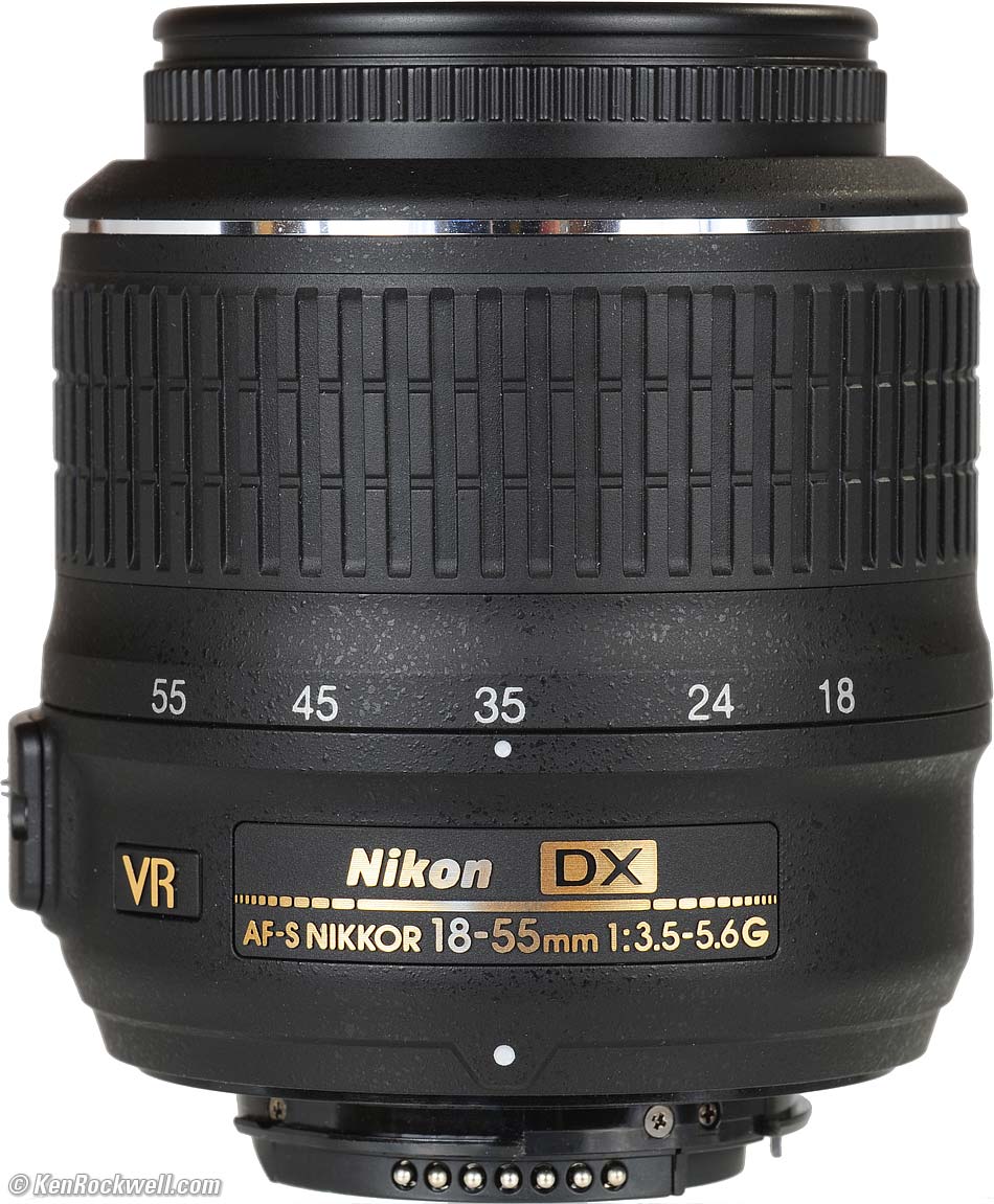 Nikon calls this the Nikon AF-S DX NIKKOR 18-55mm f/3.5-5.6G VR. AF-S: Quiet focusing with a silent wave motor (SWM). DX: Only works on digital cameras, usually gives black corners on film. G: No aperture ring. Only works on cameras newer than about 1992. VR: Vibration reduction, rated for three stops improvement. Oddly, no mention of magic ED glass, but Nikon still rates the sharpness as the same to slightly better than the 18-55mm II ED. All this and more explained in greater depth on my Nikon Lens Technology page.
