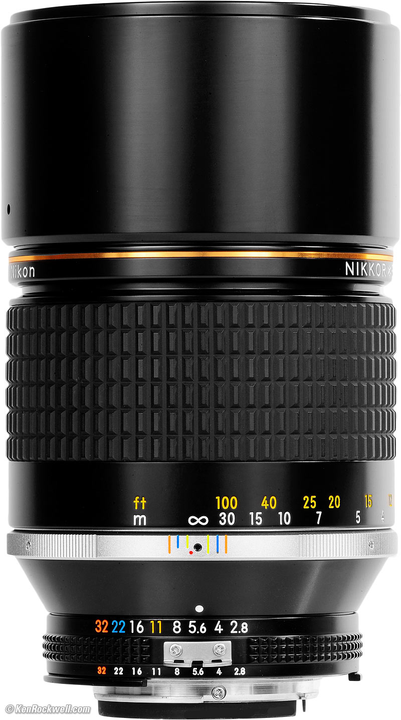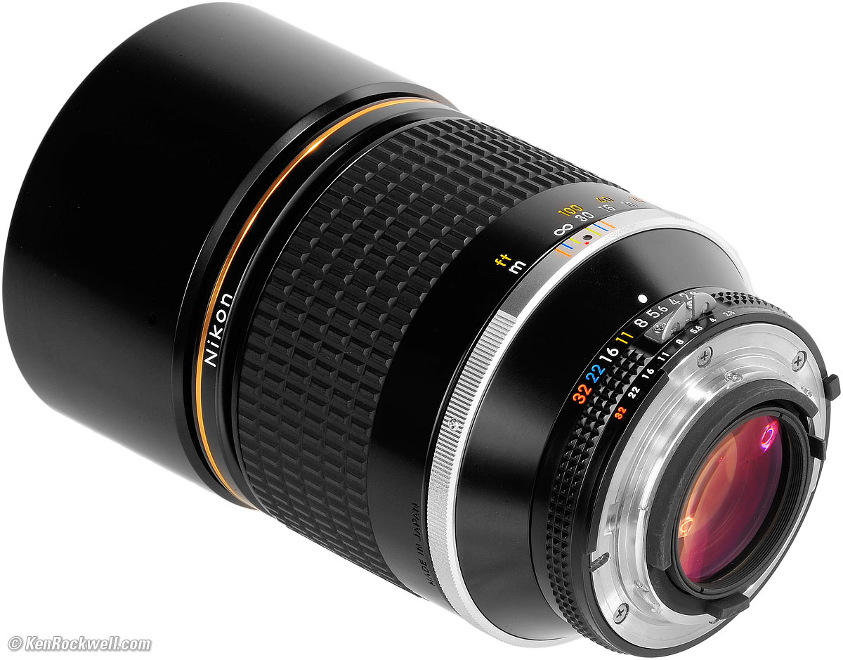 RecommendationsTop Sample Images Intro Format Compatibility Specifications Accessories Performance Compared Recommendations I love this lens. I bought my first 180/2.8 ED from B&H brand new in 1984, then two more from eBay, which is where I got this one. (How to Win at eBay). Use the autofocus version on AF 35mm SLRs and DSLRs. Use this manual focus lens on manual focus 35mm cameras. Since the FTZ adapter won't autofocus with the autofocus 180/2.8, use this manual version for cinema, video and where you want the most precise manual focusing or need f/32, which the autofocus version lacks. This 180ED, along with the legendary 105mm f/2.5, was in every pro's bag in the 1980s until replaced replaced by autofocus zooms like today's 70-200 f/2.8 zoom. You'd find one of these in every news, portrait and sports photographer's bag throughout the entire 1980s. Optically any of the fixed 180mm lenses is as sharp or sharper than the f/2.8 telephoto zooms, with less distortion, less falloff and less flare and ghosts all due to its simpler design as a fixed lens. Get a new pinch-type 72mm Nikon front cap. The flatter originals never were as handy. I use a clear (UV) protective filter instead of a cap so I'm always ready to shoot instantly. I only use a cap when I throw this in a bag with other gear without padding — which is never. The UV filter never gets in the way, and never gets lost, either. The very best protective filter is the 72mm Hoya multicoated HD3 UV which uses hardened glass and repels dirt and fingerprints. For less money, the B+W 72mm 010 is an excellent filter, as are the multicoated version and the basic multicoated Hoya filters, but the Hoya HD3 is the toughest and the best. Nikon's 72mm Clear filter is also optically excellent. Filters last a lifetime, so you may as well get the best. The Hoya HD3 stays cleaner than the others since it repels oil and dirt and is less likely to break if hit. For color slides like Velvia 50, I use a 72mm Nikon A2 filter outdoors. For B&W film outdoors, I'd use a 72mm Hoya HMC Yellow K2. If you've found the time and expense I incur to research and bring this all to you for free, my biggest source of support is when you use any of these links, especially this link directly to them at eBay (see How to Win at eBay), when you get anything, regardless of the country in which you live. Thanks! Ken. Thanks for helping me help you! Ken Rockwell.
