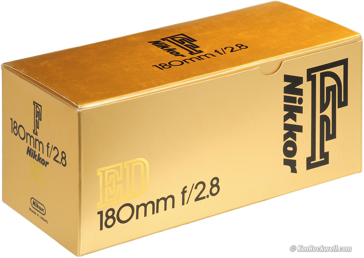 PackagingNikon NIKKOR✻ED 180mm f/2.8 AI-s. bigger. Gold foil cardboard box with lens in its case inside. Hot-stamped 24 karat gold "ED" graphics. Instruction sheet in box, outside of case. The case was included from 1987-1991, otherwise there was usually no free case included.