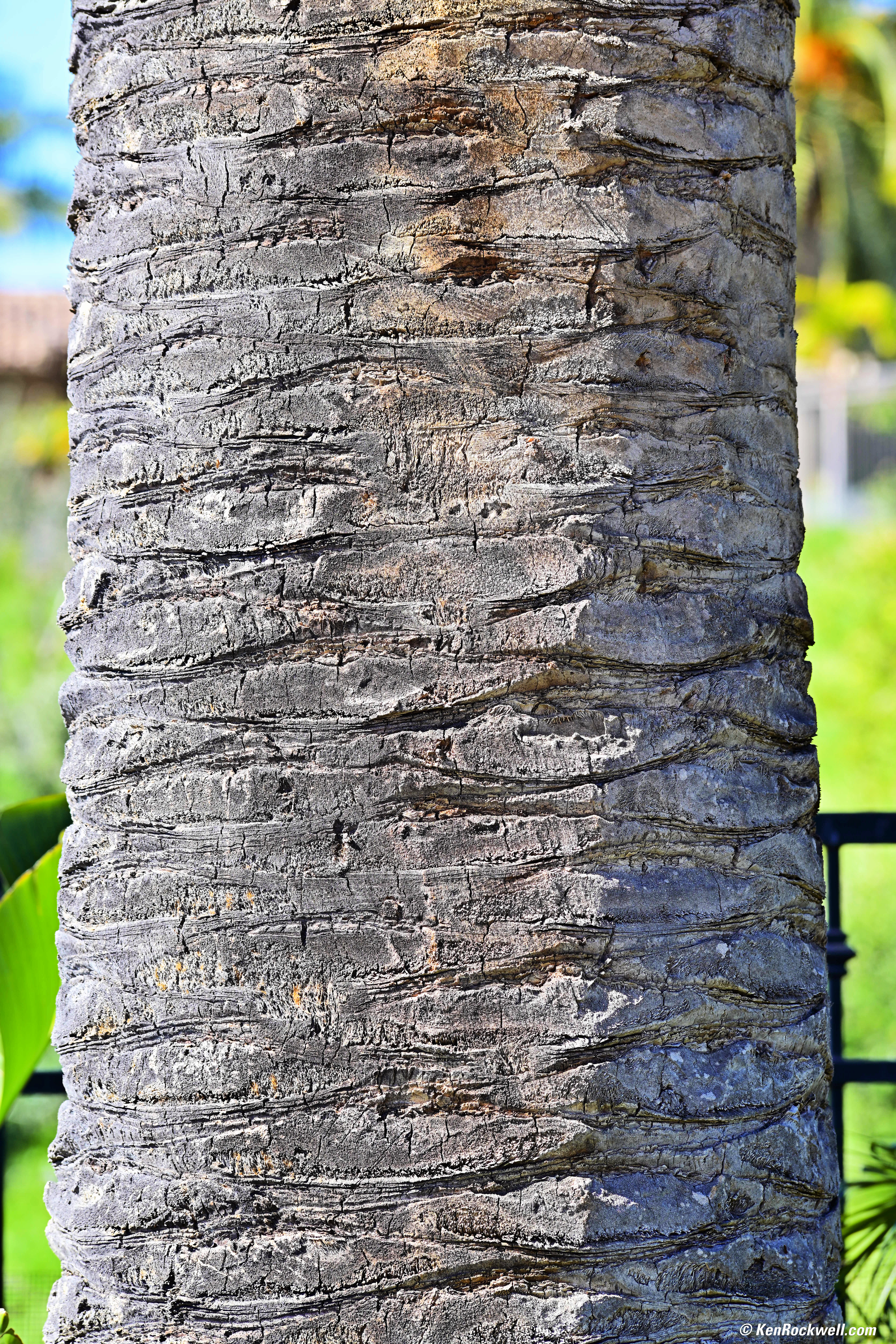 Sample ImagesTop Sample Images Intro Format Compatibility Specifications Accessories Performance Compared Recommendations These are all shot hand-held as BASIC ★ JPGs; no RAW files, NORMAL or FINE JPGs were used or needed. Canary Palm Trunk, 9:33 AM, 17 March 2019. Nikon Z7, Nikon NIKKOR✻ED 180mm f/2.8 AI-s on FTZ adapter, f/8 at 1/50, Perfectly Clear. bigger, full-resolution file or camera-original © 45MP file. The top of the trunk isn't in focus, that's not a lens defect. IntroductionTop Sample Images Intro Format Compatibility Specifications Accessories Performance Compared Recommendations
