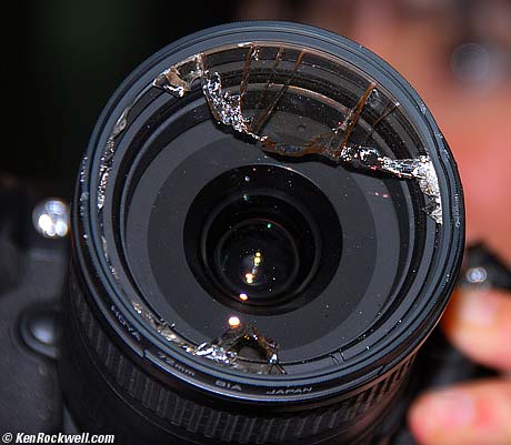 Drop Test: West Babylon, NY A reader from Long Island writes: While recently on vacation I put my D70s/18-200VR combo in a small shoulder bag since that’s easier to carry than my large camera bag. I put the shoulder bag on top of the ironing board in the room so I could “take care of mother nature” before departing for our last day of vacation. After I turned and walked away I heard a loud thud. I spun around and saw the bag on the floor. The floor was hard, but carpeted. Considering the drop was from 4’ high, and my camera and lens were only a few weeks old, my heart dropped. I opened the bag and removed the camera. As I held my breath I removed the lens cap and all I could see was smashed glass. My body instinctively stopped breathing for a second. I instantly thought “another $750 purchase when I get back home” and of course “what will the wife say about this.” But after inspecting the damage, I realized that all of the glass was from the UV filter that I put on the lens as soon as I bought it. Miraculously, the lens was not damaged at all. It took me some time to clean out the shards of glass and fine glass powder residue, and even longer to remove the warped filter ring still mounted on the end of the lens. But that was a small price to pay compared to what I thought had happened. All functionality and image quality seems to be fine. I was impressed, to say the least.