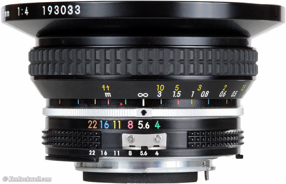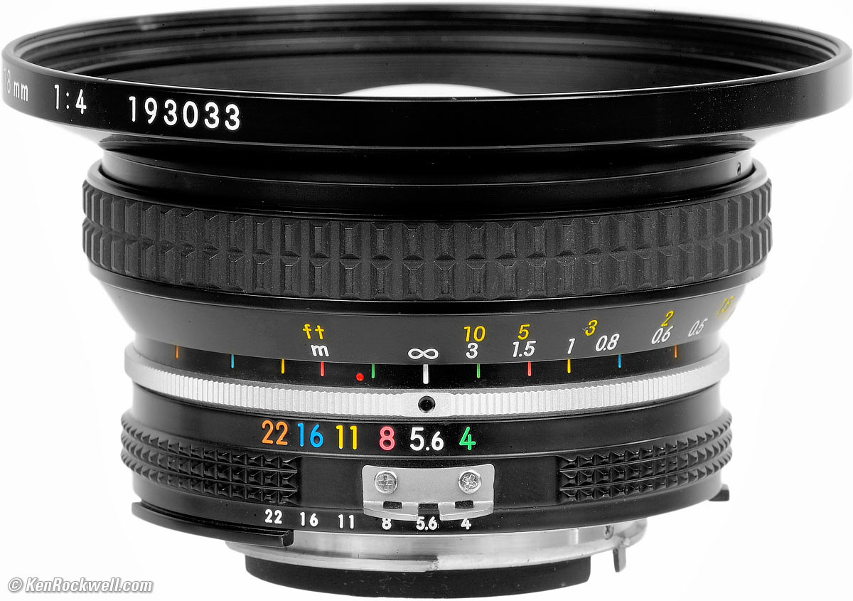 Introduction top Sample Images Intro Specifications Performance Compared Usage Recommendations Compatibility History Production This 18mm f/4 is Nikon's first 18mm lens, introduced in 1974. Presuming it's an AI version or an older version updated to AI, it works great on all full-frame Nikon DSLRs. Optically it's as good as all newer Nikon 18mm lenses; the only significantly better lenses optically are the latest 16-35mm f/4 VR and 14-24mm f/2.8 AF-S. Oddly, when you compare them closely, all the newer 18mm lenses add is the ability to use smaller filters or autofocus; basic optical quality isn't any better in the newer fixed 18mm lenses. This was one of Nikon's most expensive lenses when new, and it's still very expensive today.