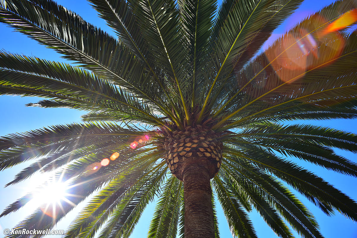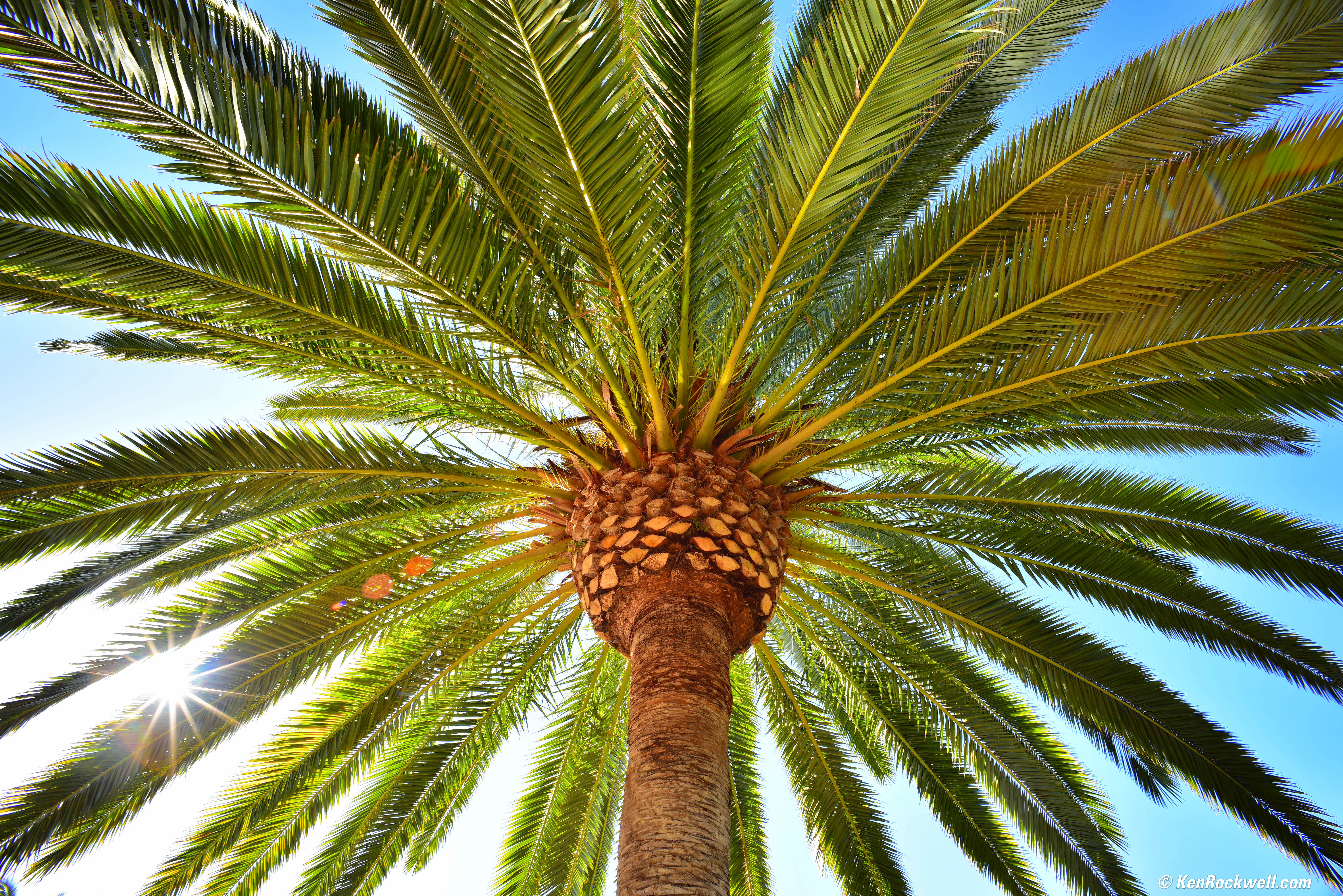 Sunstars performance top With its straight 7-bladed diaphragm, the 18mm f/4 makes magnificent 14-pointed sunstars on brilliant points of light. Palm with sunstar, 10 February 2015. Nikon D810, Nikon 18mm f/4, f/11 at 1/30 at ISO 100. Full resolution.