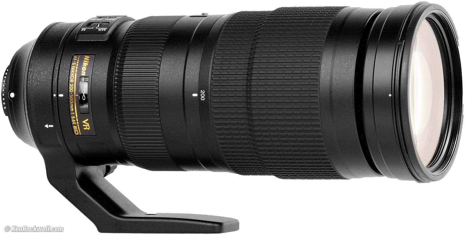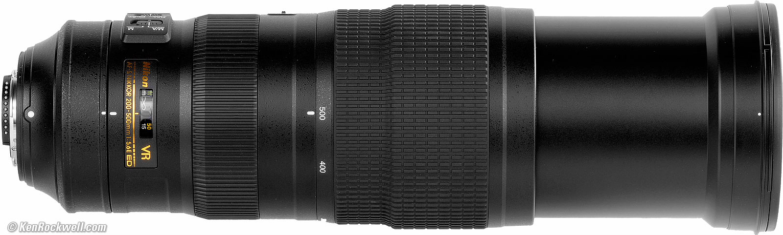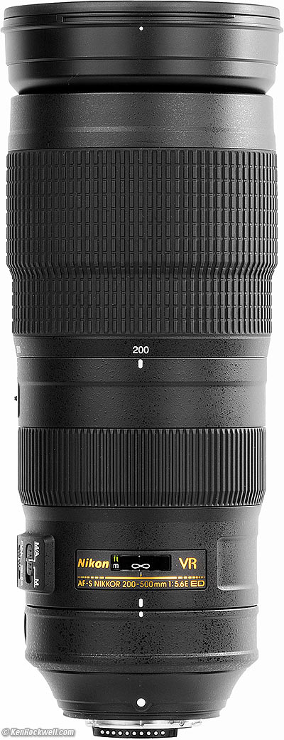 Nikon AF-S NIKKOR 200-500mm f/5.6E ED VR (FX and DX coverage, 95mm filters, 81¼ oz./2,300g with collar, 73¾ oz./2,090g without collar, 7.2'/2.2 m close focus, $1,397 new or about $775 used at eBay if you know How to Win at eBay). bigger. I got mine at Adorama; I'd just as well get it at B&H, at Crutchfield, at Amazon or used at eBay. This all-content, junk-free website's biggest source of support is when you use those or any of these links to approved sources when you get anything, regardless of the country in which you live. Nikon does not seal its boxes, so never buy at retail or any source not on my personally approved list since you'll have no way of knowing if you're missing accessories, getting a defective, dropped, damaged or used product, a customer return or if the warranty has already been registered to someone else online! The approved sources I use ship from secure, remote automated warehouses where salespeople or other customers never, ever get to touch your lens before you do, and they have the best prices, selection, service and return policies.