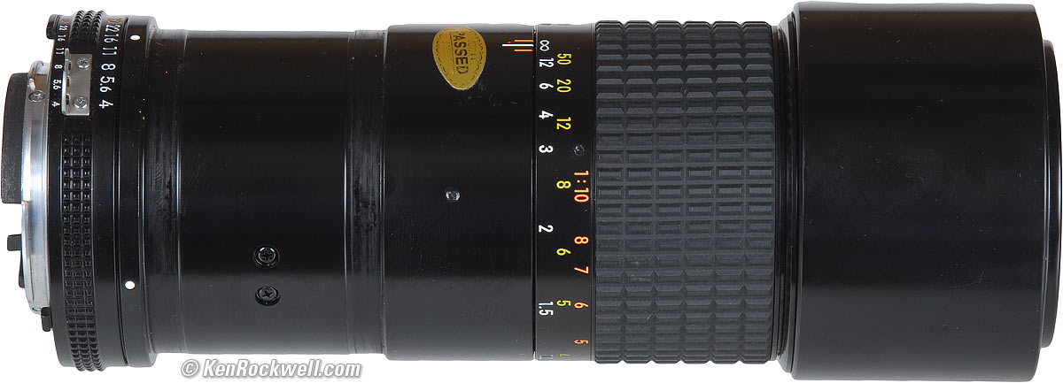 Compatibility History Production The Nikon 200mm f/4 Micro-NIKKOR AI-s is precision incarnate. It is the world's first 200mm micro lens. Everything about it says precise. The focus is out-of-this-world: one finger is enough to flick the focus ring, which feels as if it's floating on air, from infinity to 1:2. This 200mm f/4 Micro-NIKKOR uses internal focusing, so nothing moves externally as focused. It's a great lens for anything, however if you're shooting products with black-and-white graphics in the closest macro range and looking closely, you'll see some red-blue color fringing on sharp outlines at the sides. Optics are excellent otherwise, and the mechanical quality of this piece is fantastic.