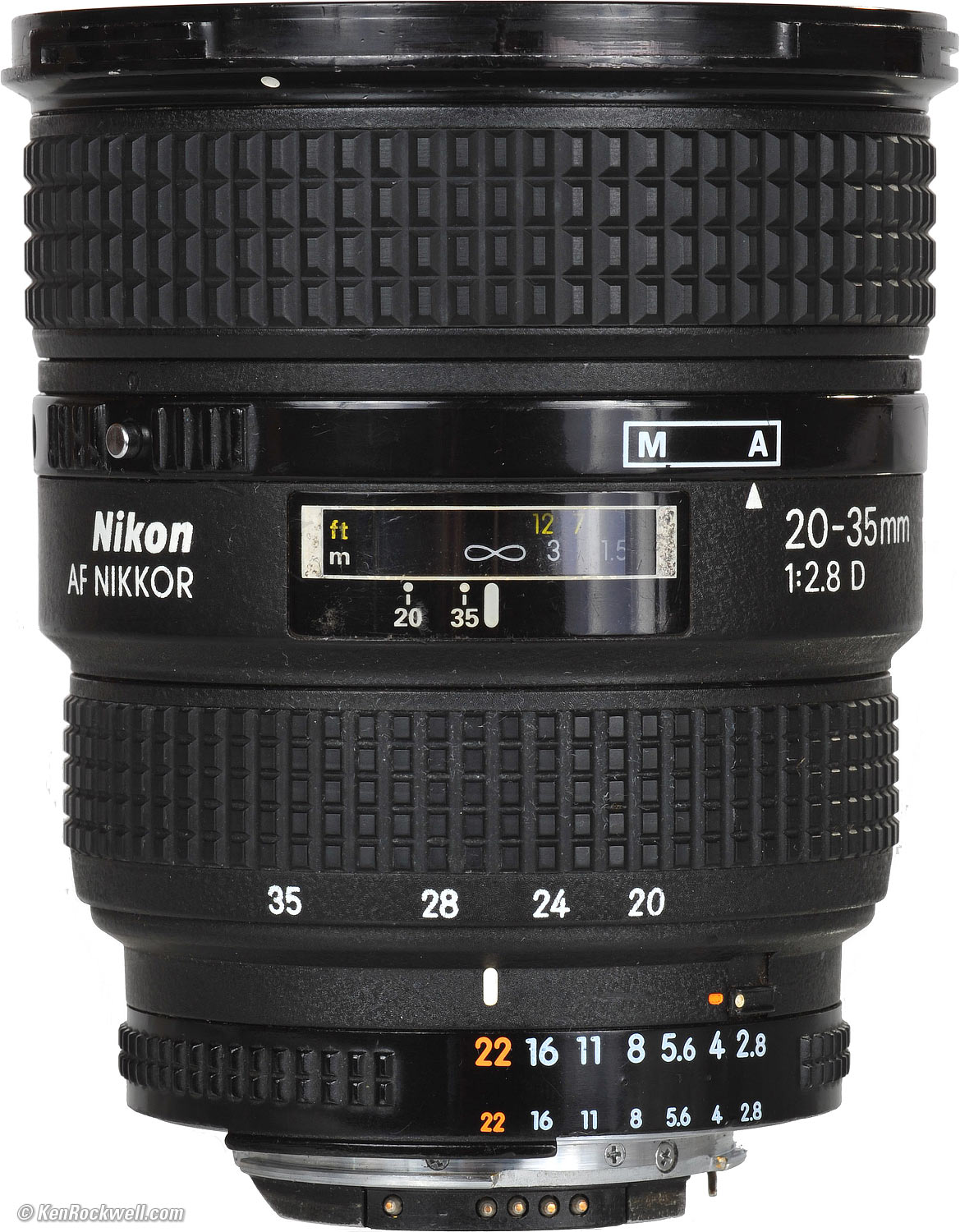 Construction and Materials top Engraved markings on front ring. Overall: Lots of metal. Crinkle finish paint. AF - MF ring: Plastic with metal lock button. Zoom Ring: Painted metal with rubber grip. Filter thread and bayonet hood mount: Anodized aluminum. Front ring markings: Engraved and filled. Barrel and aperture ring markings: Painted. Serial number: Laser-burnt into bottom of aperture ring. Mount: Chromed brass. Black screw on mount to help when mounting on camera? Yes. Nikon 20-35mm. enlarge. Use with Filters top No problem; even on full-frame, my conventional rotating polarizer or rotating screw-in graduated ND (each 7mm thick excluding threads) work without any vignetting at every aperture and focal length. If you want to use two of these stacked (14mm thick excluding threads), it works great, but only from 24-35mm. There's vignetting with two stacked fat filters at 20mm at all apertures on film and FX Digital. It's still no problem on DX digital. The filter ring never moves with either zooming or focusing.